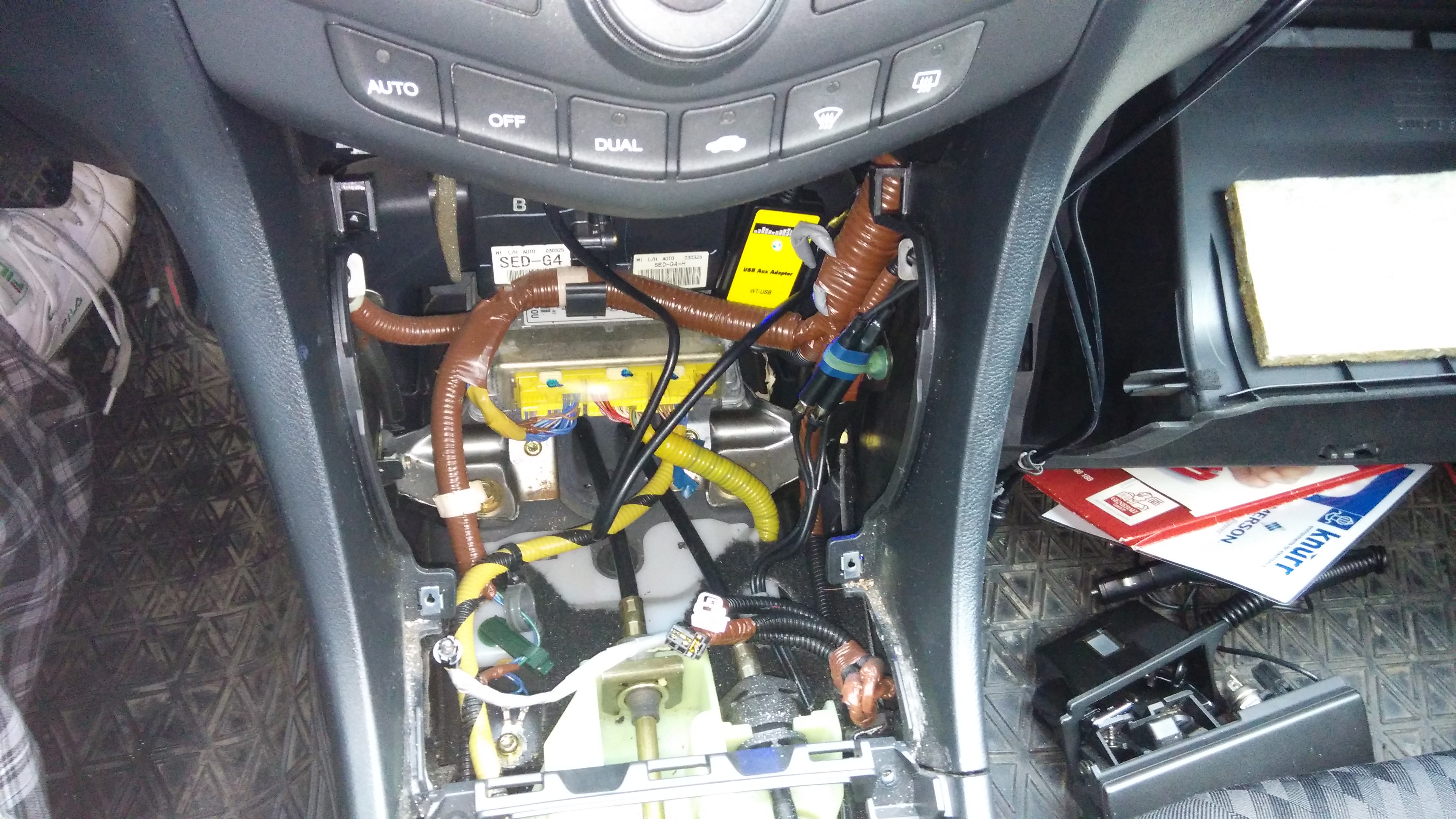 Krabičku jsem nechal pod kastlikem a kabely jsem vyvedl do prihradky před spolujezdce.