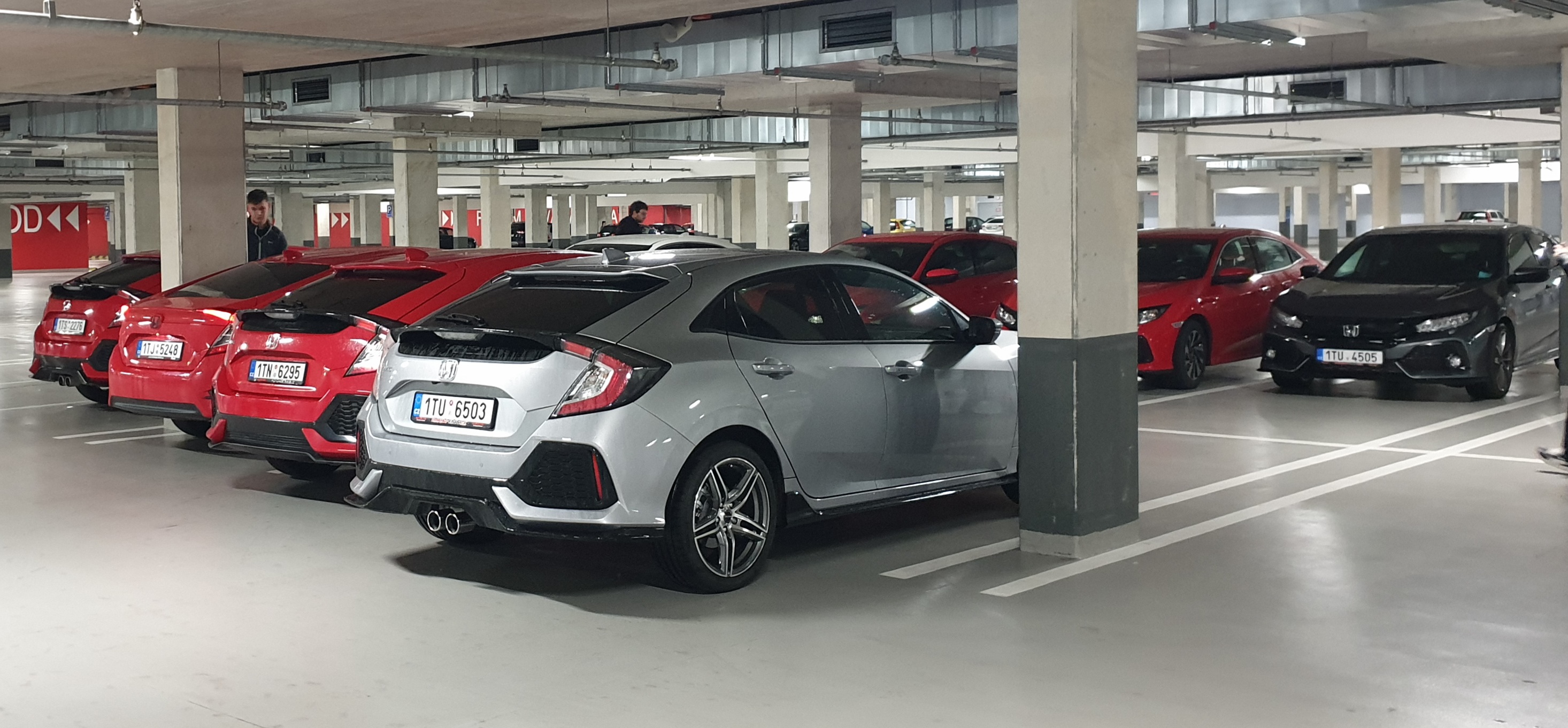 Počasí nás nerozhodilo, takže srázek proběhl v podzemních garážích OD Karolína. Účast 9 Civiků 10G (převádala červená), 1 upravený Civic 8G. D.a.l.iho sedan dorazil později, takže na fotce není, škoda.