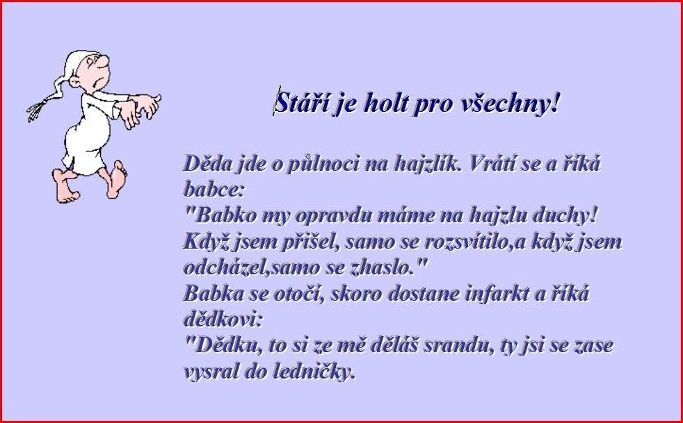 Po divokým mejdanu se dva probuďej vedle sebe a on se jí ptá: Kolik Ti je? No tolik na kolik vypadám... On na to: Mě neser, tak dlouho lidi nežijou!