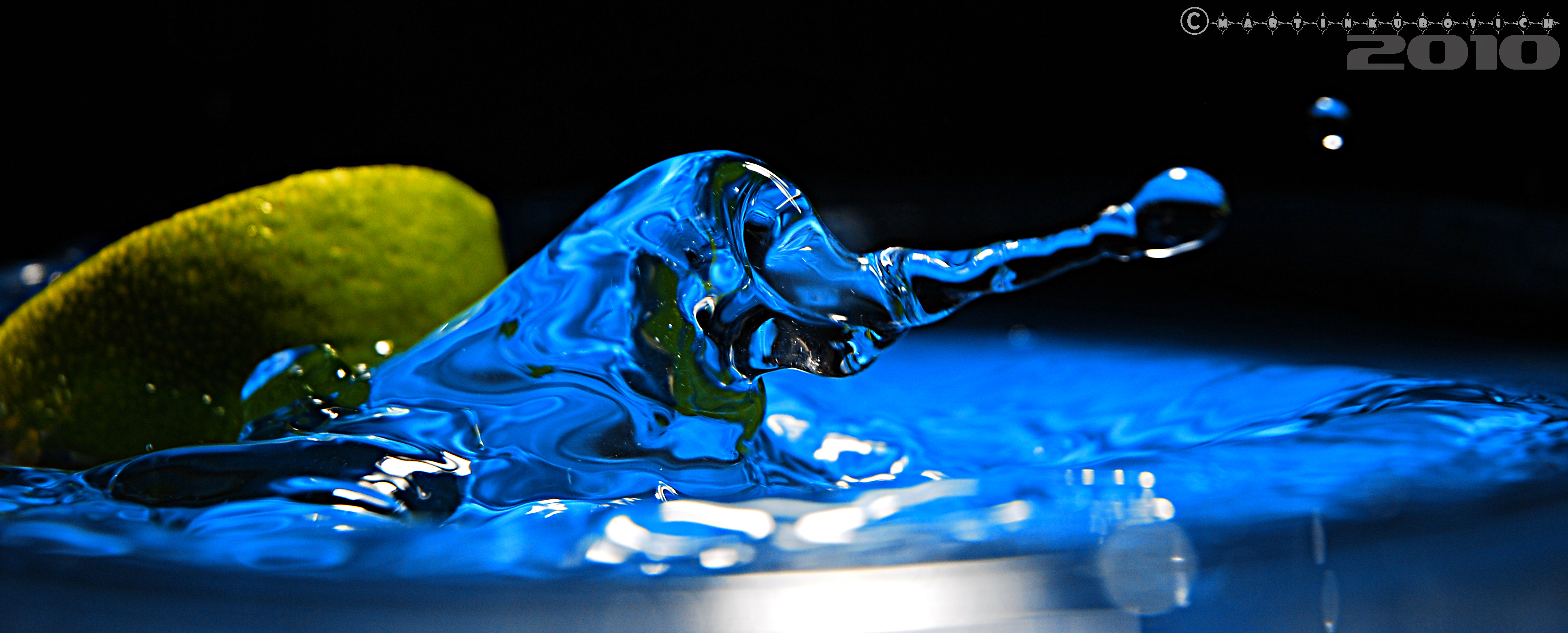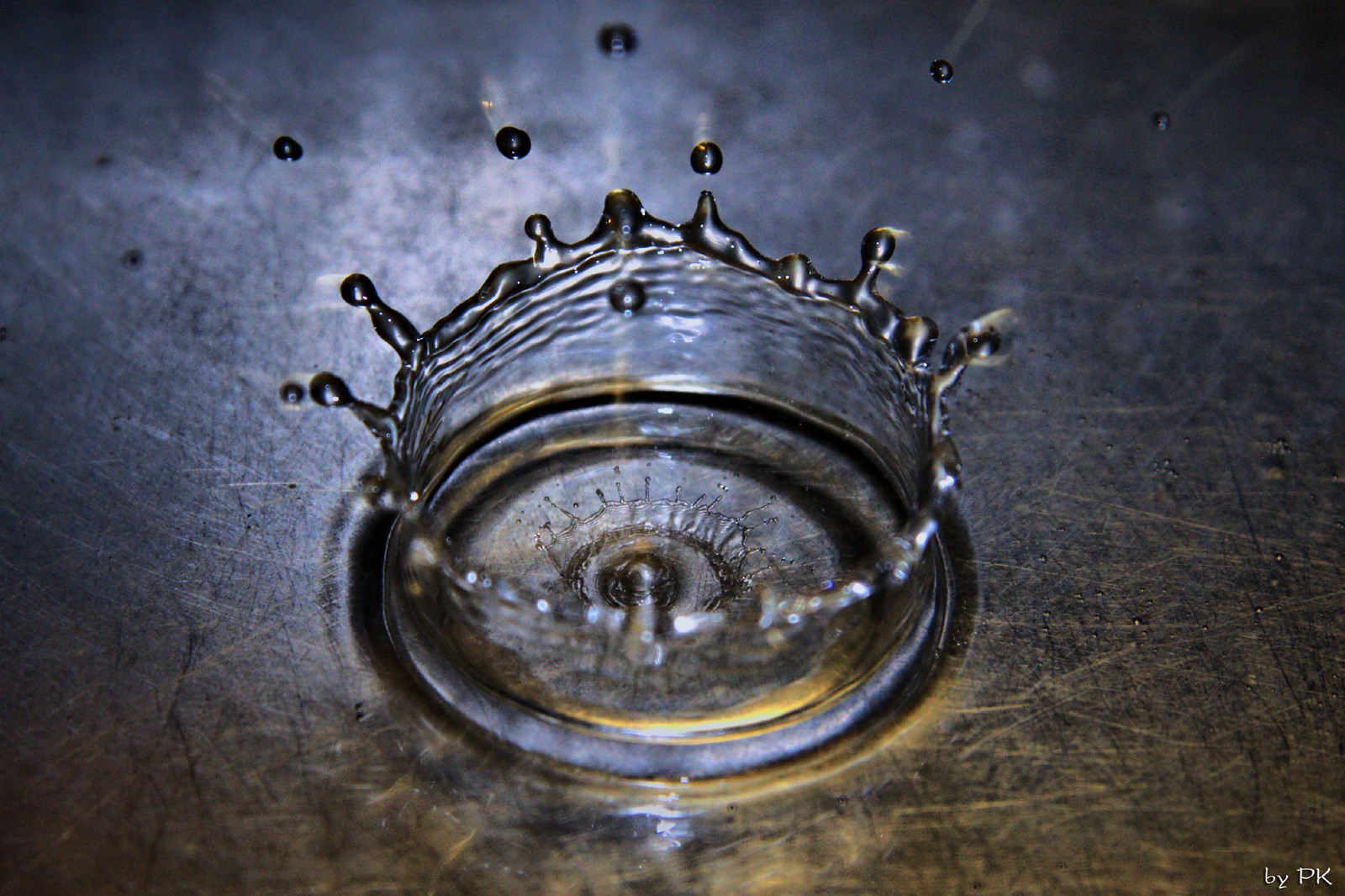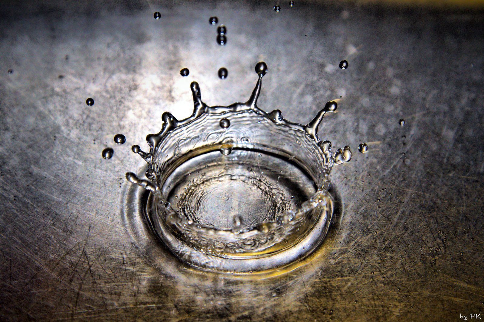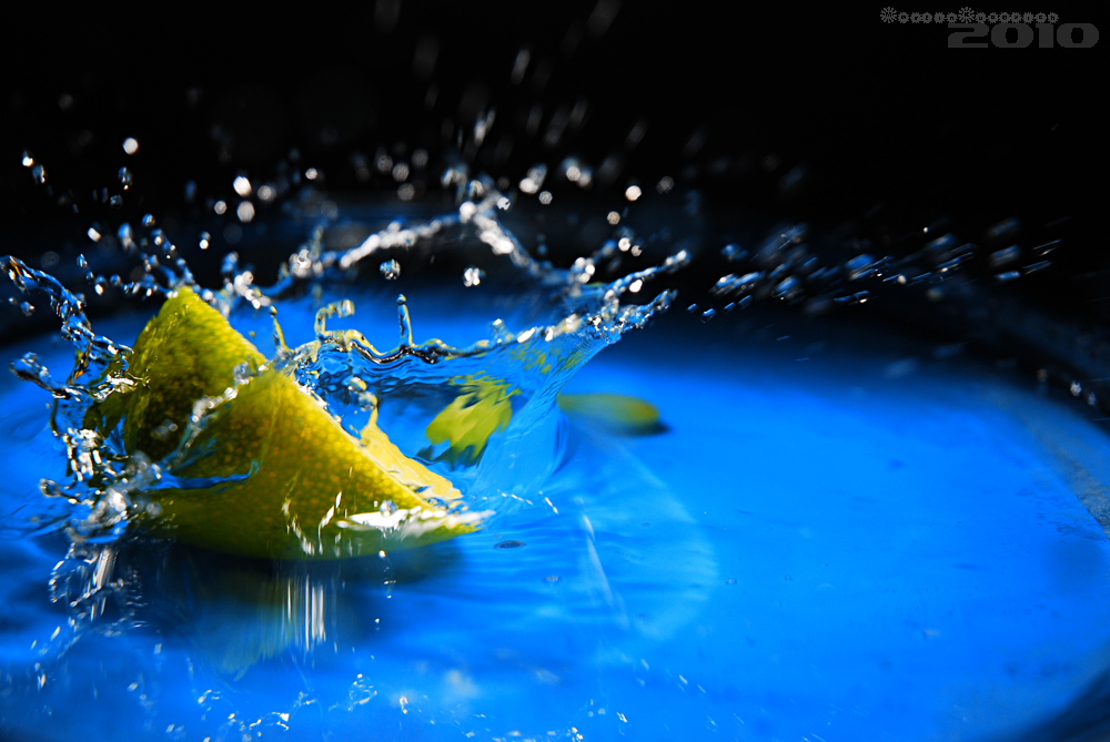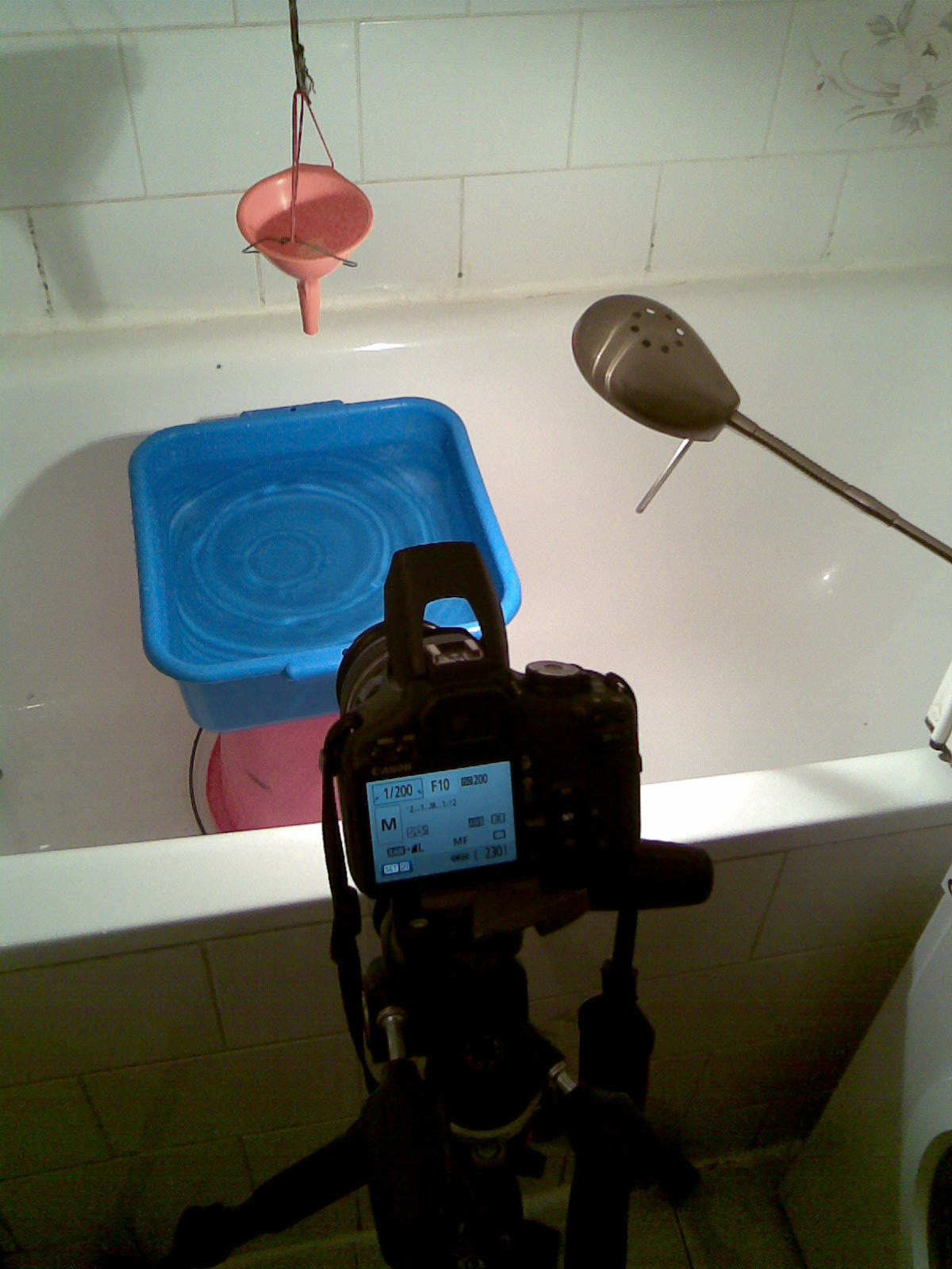 To jsem ještě neměl externí blesk, takže zrcadlovka na stativu, manuální nastavení na krátké časy, větší clonu (kvůli větší hloubce ostrosti), manuálně nastavené ostření na jeden bod a k tomu je samozřejmě potřeba dostatečné světlo - proto ta silná lampa v pozadí. Vše v koupelně, lavor na nohy napuštěný vodou. Nad lavorem na provázku upevněný trychtýř ucpaný toaletním papírem a upravený tak, aby kapání nebylo ani moc časté ani moc pomalé, do toho jsem zkoušel kapat vodu, pak sirup, pak mléko... Nejlepší kapky dělal nakonec sirup - zřejmě díky hustotě. Udělal jsem desítky a desítky fotek, pokaždé odhadování a trefa při pádu... Poté výběr a výřez v Lighroomu...