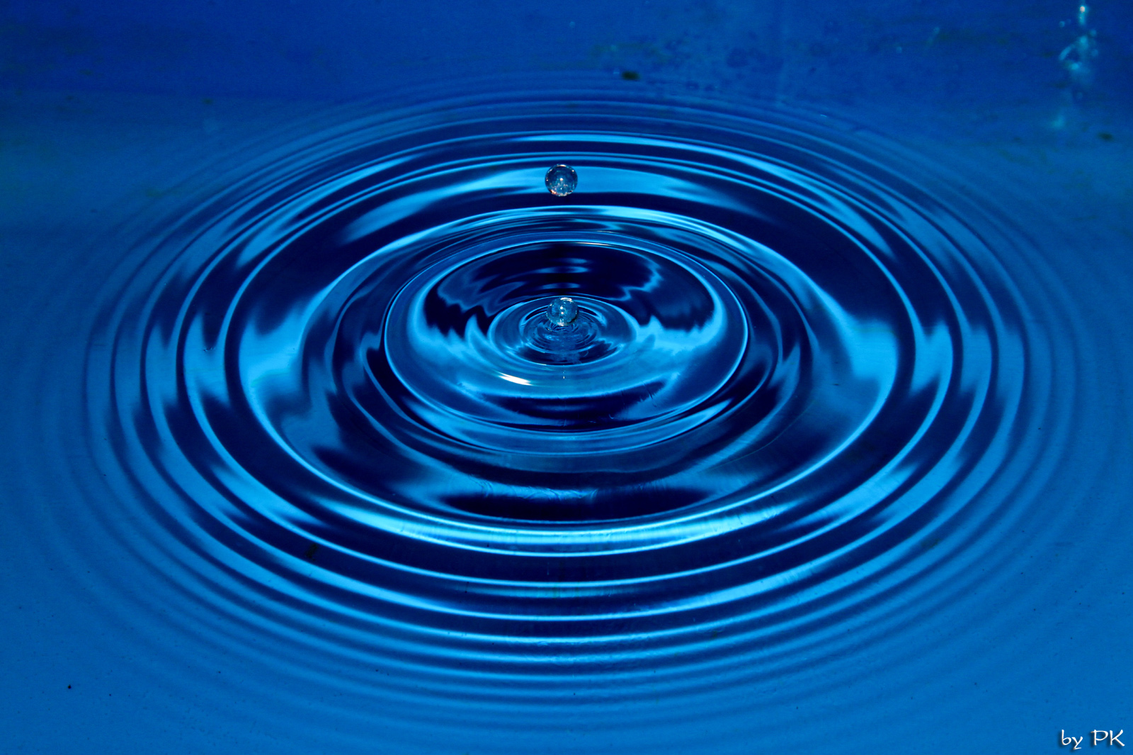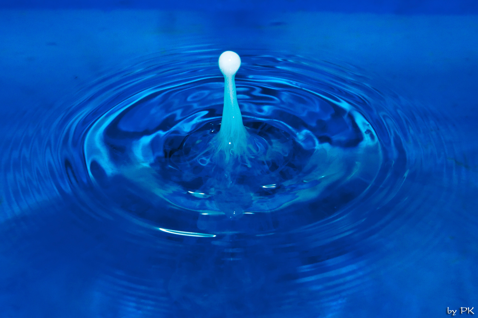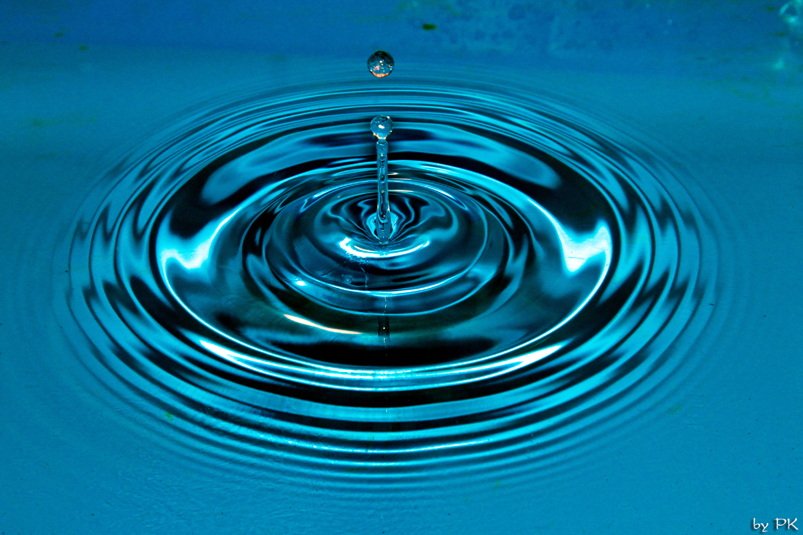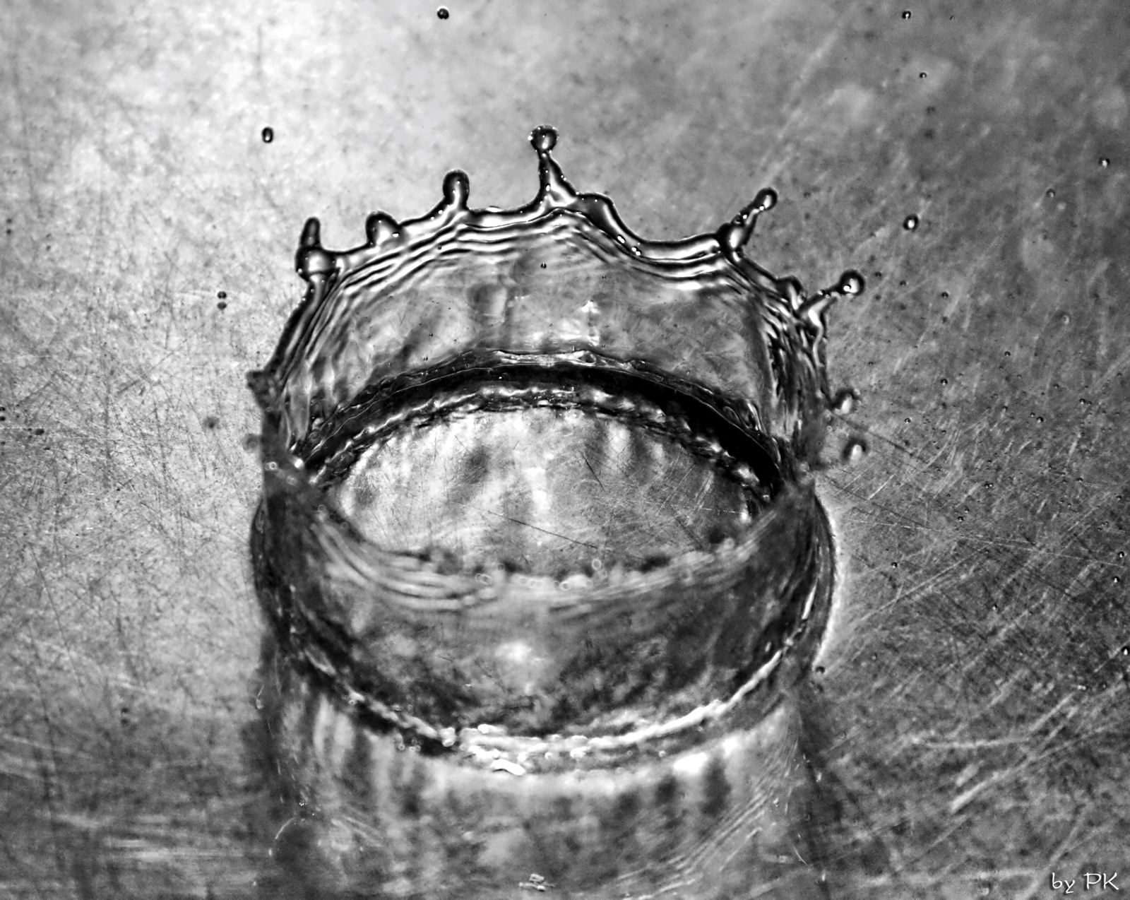To jsem ještě neměl externí blesk, takže zrcadlovka na stativu, manuální nastavení na krátké časy, větší clonu (kvůli větší hloubce ostrosti), manuálně nastavené ostření na jeden bod a k tomu je samozřejmě potřeba dostatečné světlo - proto ta silná lampa v pozadí. Vše v koupelně, lavor na nohy napuštěný vodou. Nad lavorem na provázku upevněný trychtýř ucpaný toaletním papírem a upravený tak, aby kapání nebylo ani moc časté ani moc pomalé, do toho jsem zkoušel kapat vodu, pak sirup, pak mléko... Nejlepší kapky dělal nakonec sirup - zřejmě díky hustotě. Udělal jsem desítky a desítky fotek, pokaždé odhadování a trefa při pádu... Poté výběr a výřez v Lighroomu...