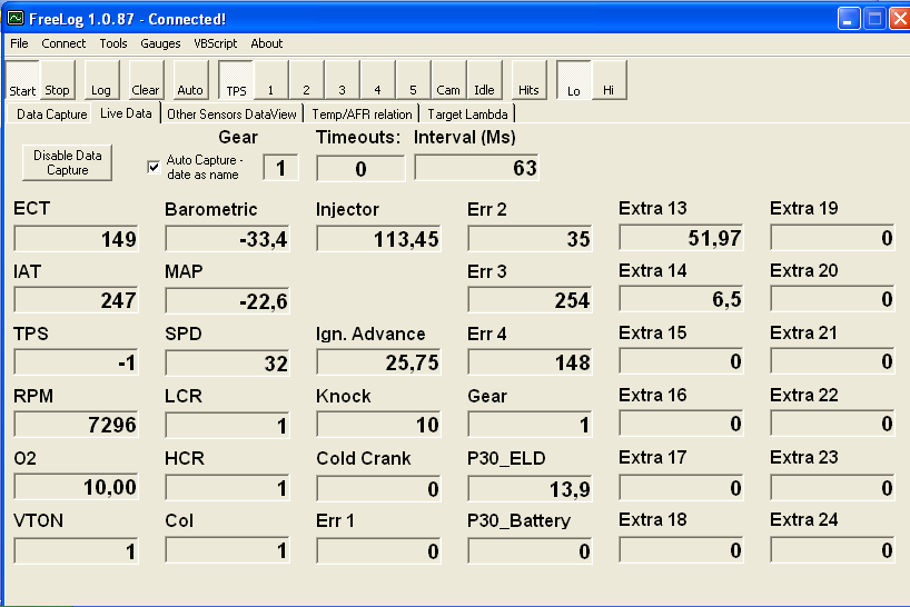 Tak jsem zkusil připojit počítač - přes usb/serial převodník vykuchaný ze staršího kabelu od mobilu jsem navázal komunikaci s ECU pomocí programu freelog, leč hodnoty, co to servírovalo, jsou vesměs dost mimo cože cože ? sedí akorát gear (jak to ví? podle poměru otáček a rychlosti asi - ale jak, když RPM i SPD to ukazuje blbě?), sedí i TPS a MAP, ale tím to končí..