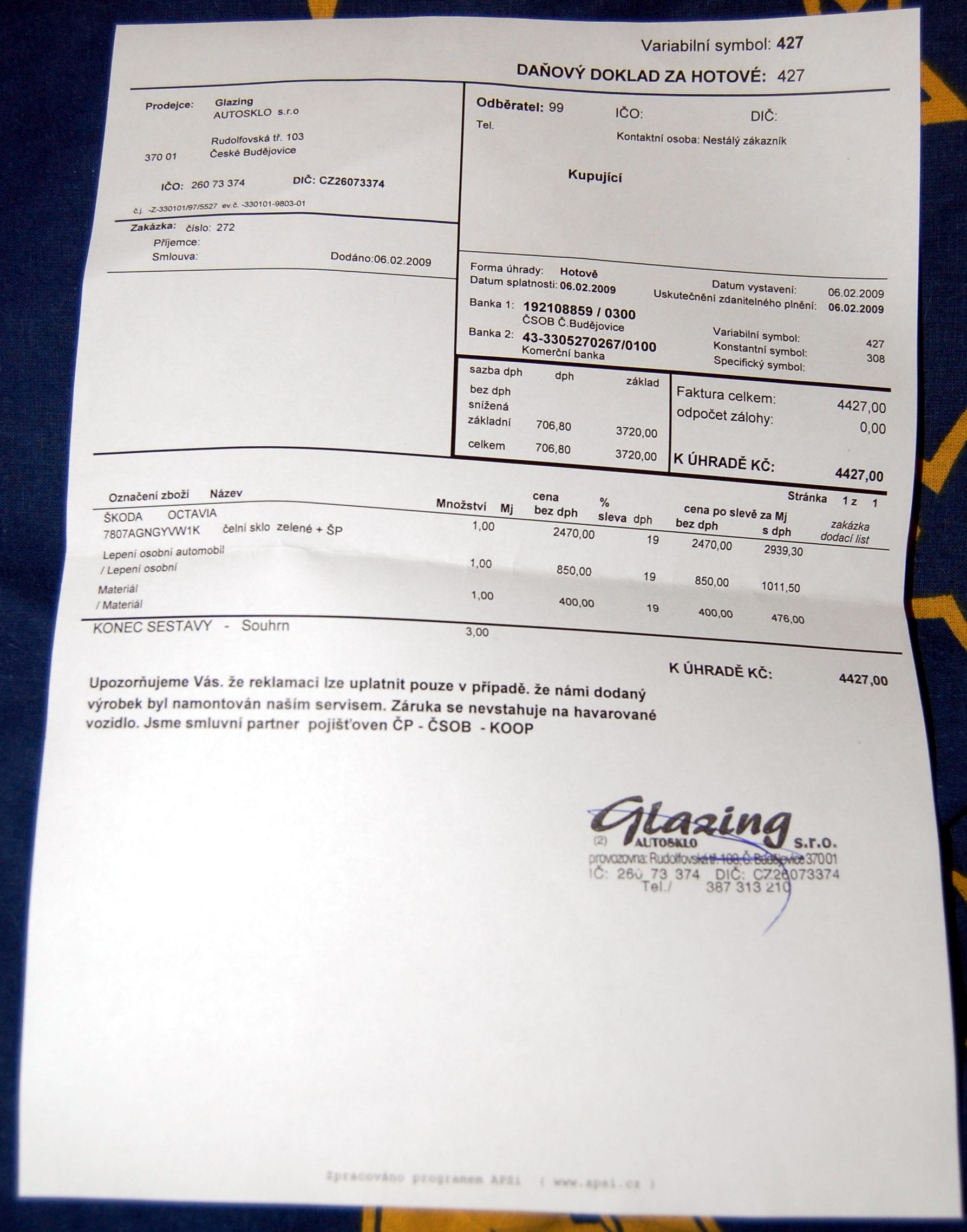 Příklad a má zkušenost s výměnou čelního okna loni v 03/2008: