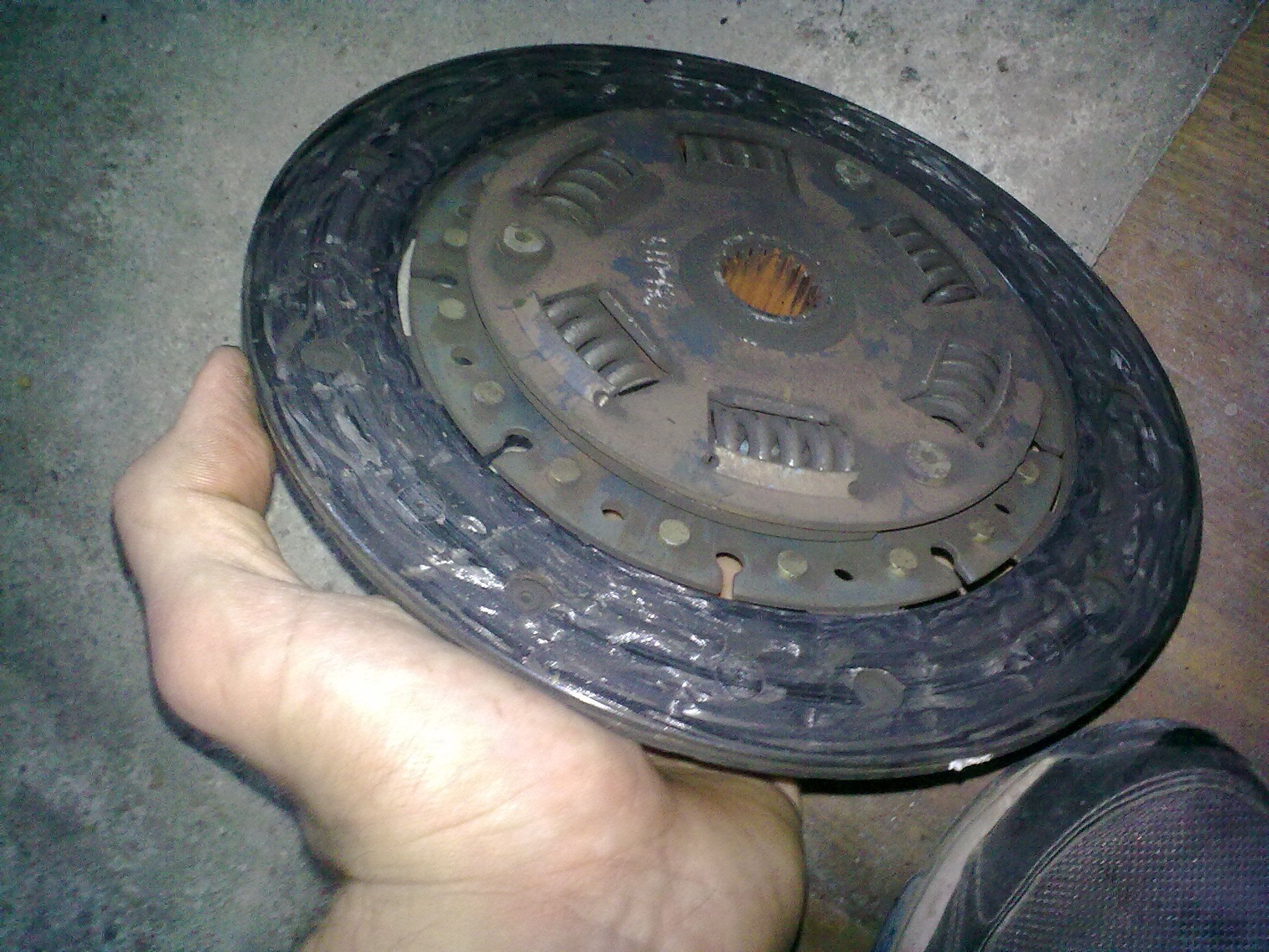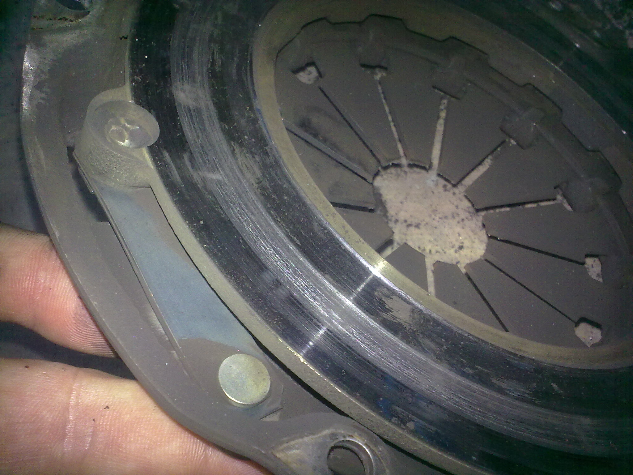 Ježíšek mě nadělil konečně novou spojku od Nipartsu, jelikož stará už klouzala při řazení ve vtecu. Jsem zvědaví co to vydrží Musim řéct, bylo to za 5 12. Z počátku při rozdělávání to vypadalo, že se jen něco zasekává a spojka vypadala dobře. Jenže tomu tak nebylo, odělal jsme přítlačák a co na mě vyběhlo, asi kilo prachu a bordelu. Na lamele už jsem valil nýty a přítlačák vypadal jako pěkně jetý kotůč. Po chvilce zkoumání proč tohle nastalo se zjistilo, že ložisko a hřídel byly úplně suché, pomalu už zrezlé, proto nechctěla vypínat. Lamela byla z jené strany jak nová a z druhé úplně ko, nastěstí to nevypínalo na straně přítlačíku, který se měnil. Vše se tedy obrousilo, namazalo, vyčistilo, rozhýbalo a už zase vtecuju dál. Při té příležitosti jsme zdělal a rozdělal startér a komplet promazal, prostříkal kontakty.