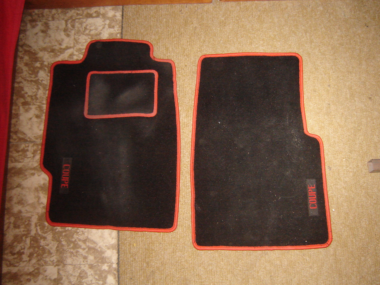 Koberce na míru, červene obšité s nápisem Coupe
