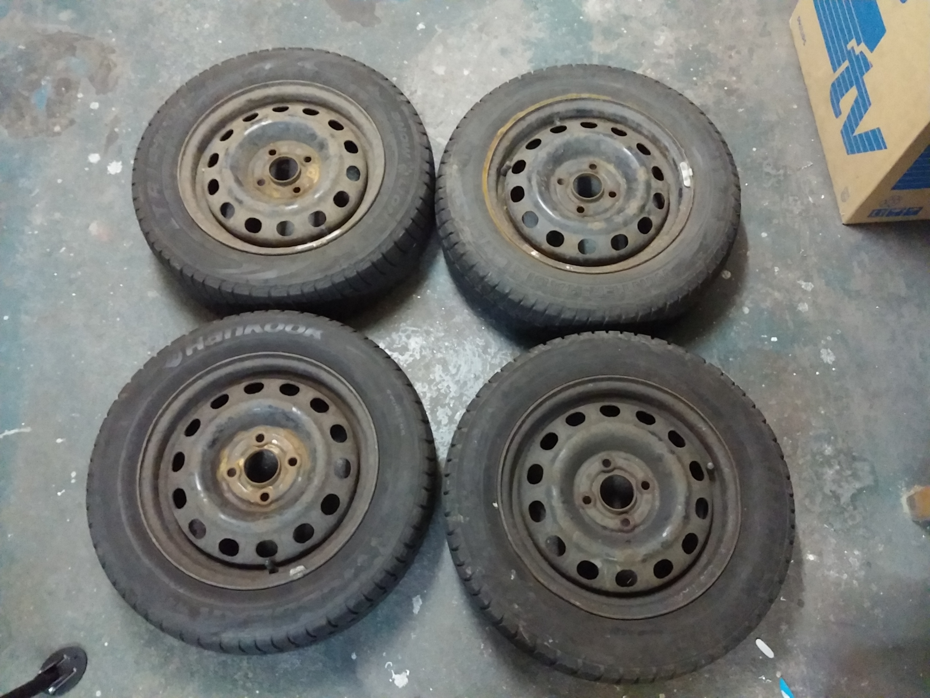 Sada 14" plechů - t.j. 4 kusy ráfků i s pneu - ty jsou ale spíše na vyhození.