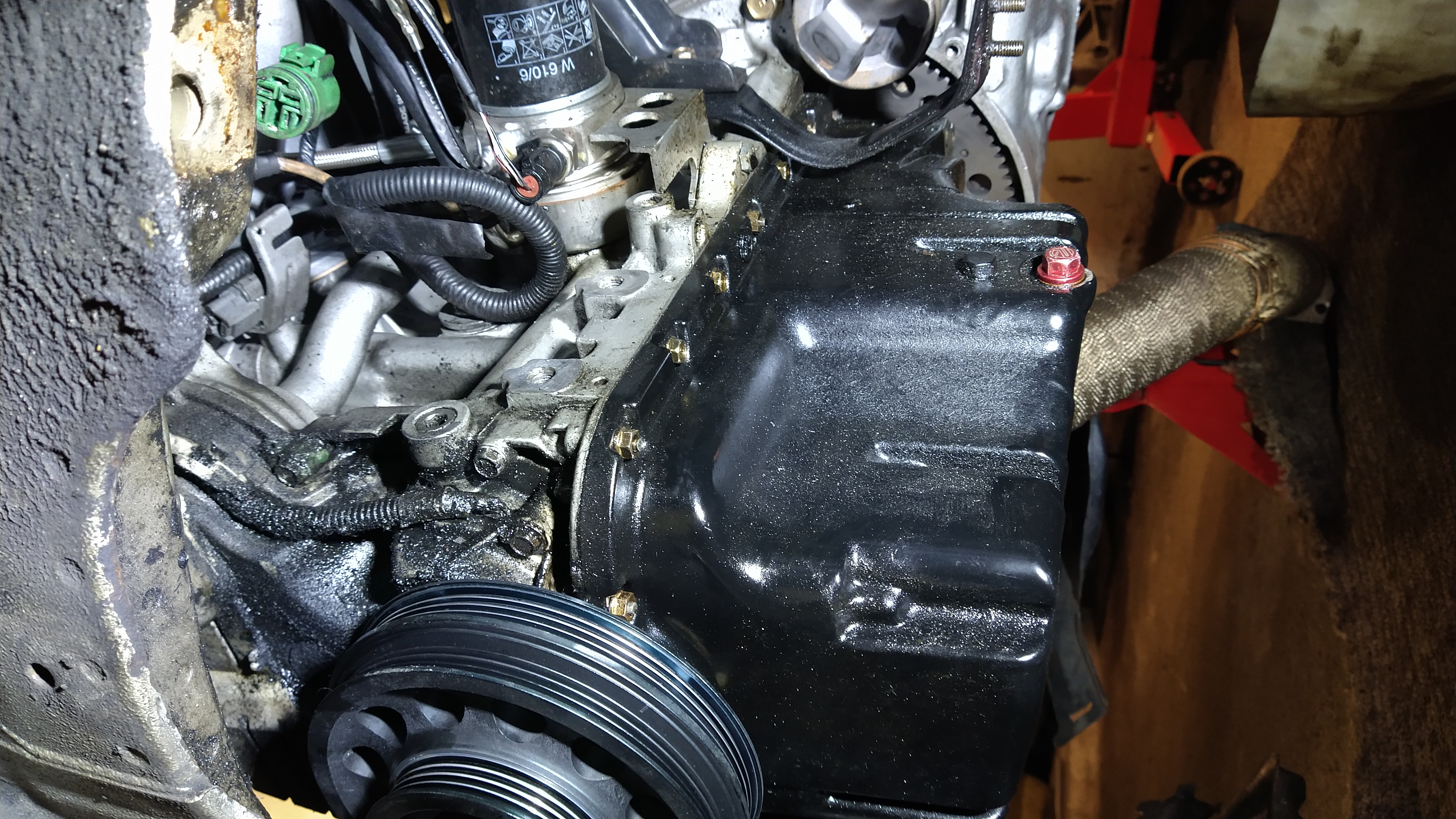 Tak téměř hotovo. Ještě geomku a pokud nikde nic nepotece (přetěsňoval jsem řízení, olejové čerpadlo, snímač tlaku oleje a výměník voda/olej) tak si můžu zase užívat nějaké to nešetrné zacházení VTEC