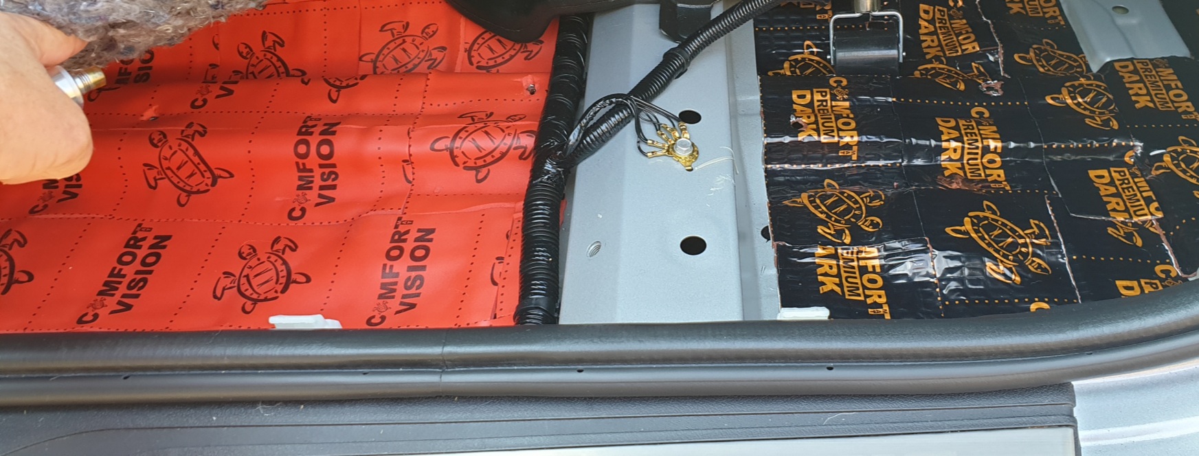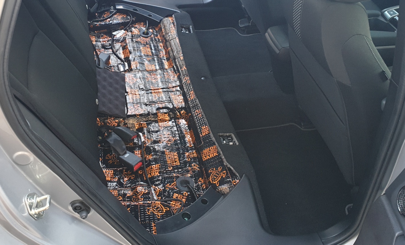 Včera dolepeny poslední zbytky tlumení, a to pod zadní sedačky a okraje podběhů. K vůli "patentu" - zámcích sedačky, jsem použil jen antivibrační materiál Dark D2, protože druhá vrstva by neumožnila zámky docvaknout. Takže mi zbylo 9 plátů Vision.