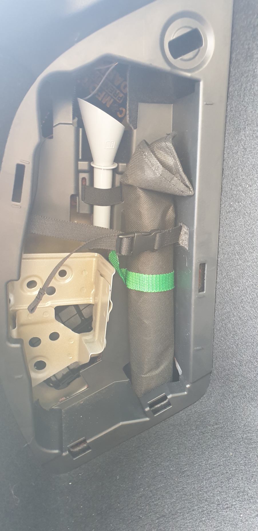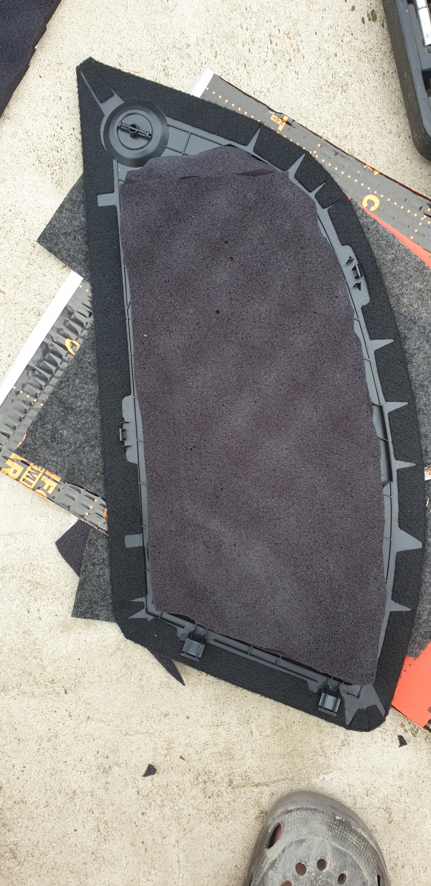 Zprvu jsem dal wave na zadní část toho kastlíku, ale nepodařilo se mi to spasovat (zasunout) zpět. Takže jsem nakonec zvolil cestu vytlumení krytu a pohoda. Chci, ať je to "čisté" a nic nebije do očí. Proto jsem nalepil i ten "reprobednový" koberec na poslední vrstvu tlumení, do prostoru pro rezervu. Je to na pohled prostě hezčí.