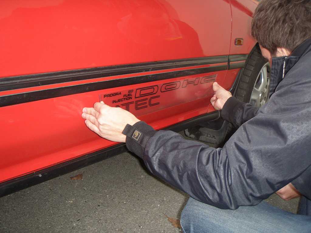 3. po rozdělení přenosky na dvě části (spodní hladkou se čtverečky a vrchní, na které je nyní nápis) stačí jak podklad tak fólii s nápisem důkladně potřít tou jarovou vodou (např. za pomocí houbičky) a přiložit na požadované místo...jarová voda způsobí, že s fólií lze celkem snadno pohybovat a vystředit tak nápis do požadované polohy...pak už jen plastovou stěrkou vytlačíš přebytek vody - pozor, opatrně ať se to nepohne ! a ještě než sundáš přenosku tak doporučuju pořádně přitlačit a vyhladit aby to opravdu dobře sedlo a při prvním mytí se nazačlo na krajích odlupovat...