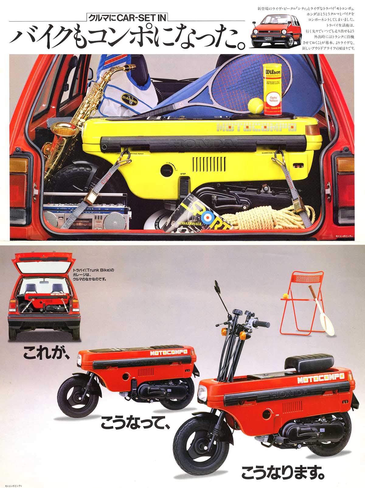 Motocompo, který se dá složit do balíčku a vejde se do kufru. Obsah 49ccm 2,5kw, hmotnost 45kg. Nádrž má na 2,2L a na jeden litr ujede 70km v max. rychlosti 30km/h.