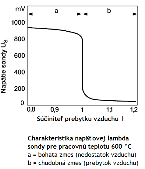 Díky vzniklému rozdílu potenciálu bude elektrické napětí (U) na platinových elektrodách. Je-li směs chudá, činí signál sondy cca 0,1 voltu. Je-li směs bohatá, činí signál sondy cca 0,9 voltu. Při lambda=1 dochází k charakteristickému skoku napětí 0,8 voltu.