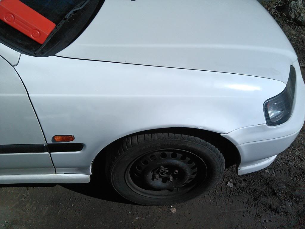 já dneska strávil celej den s cívou na zahradě, po krátkym výletu následovalo očištění ALU aby byly připravený až na to přijde, a pak se sundal blatník, a brousilo se, teď se kitovalo, zejtra se to přebrousí do hladka a půjde to do bílýho lídl laku ve spreji tak jsem zvědavej jak bílá ta bílá bude oproti tý bílý na autě Velmi šťastný