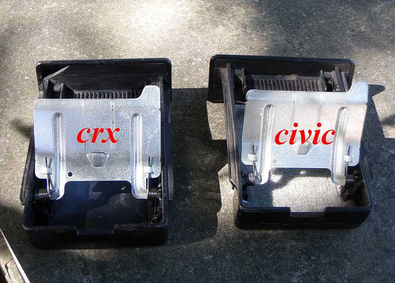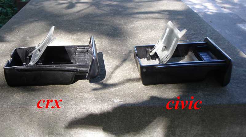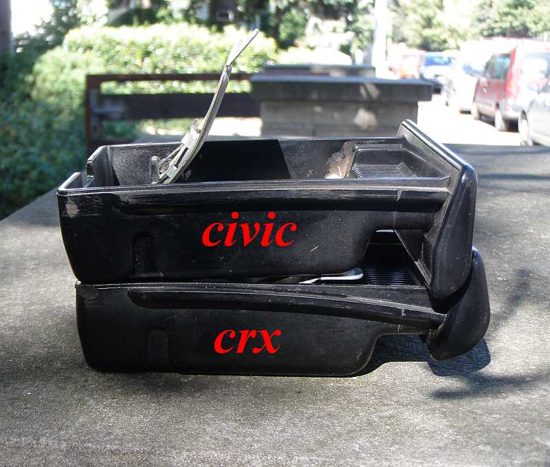 Při svém soukromém a nikterak uspořádaném pátrání po rozdílech mezi crx a civicy jsem narazil i na tuhle stěží uvěřitelnou drobnost - ta auta mají různé popelníky, které nejsou navzájem záměnné, viz fotky.
