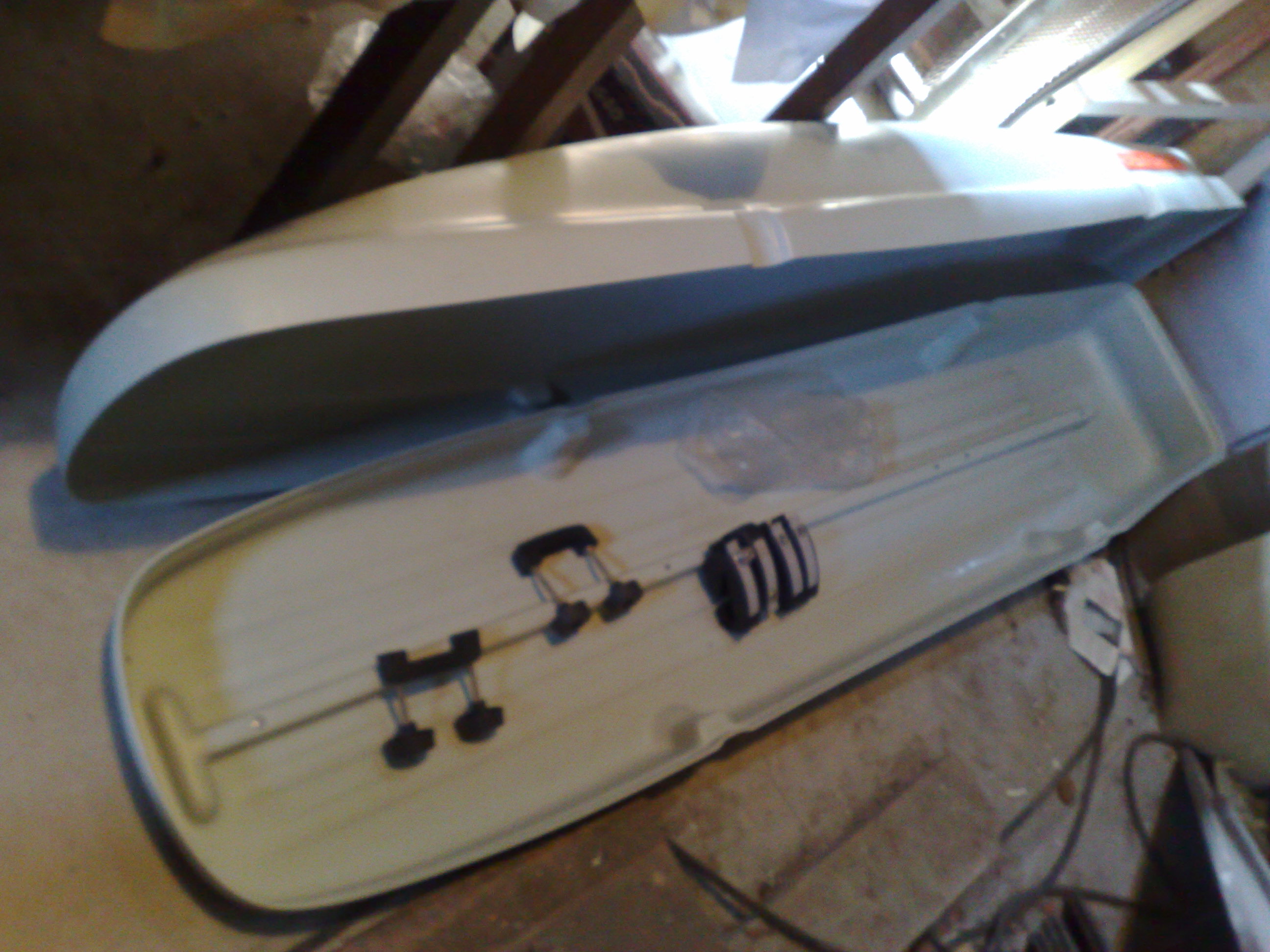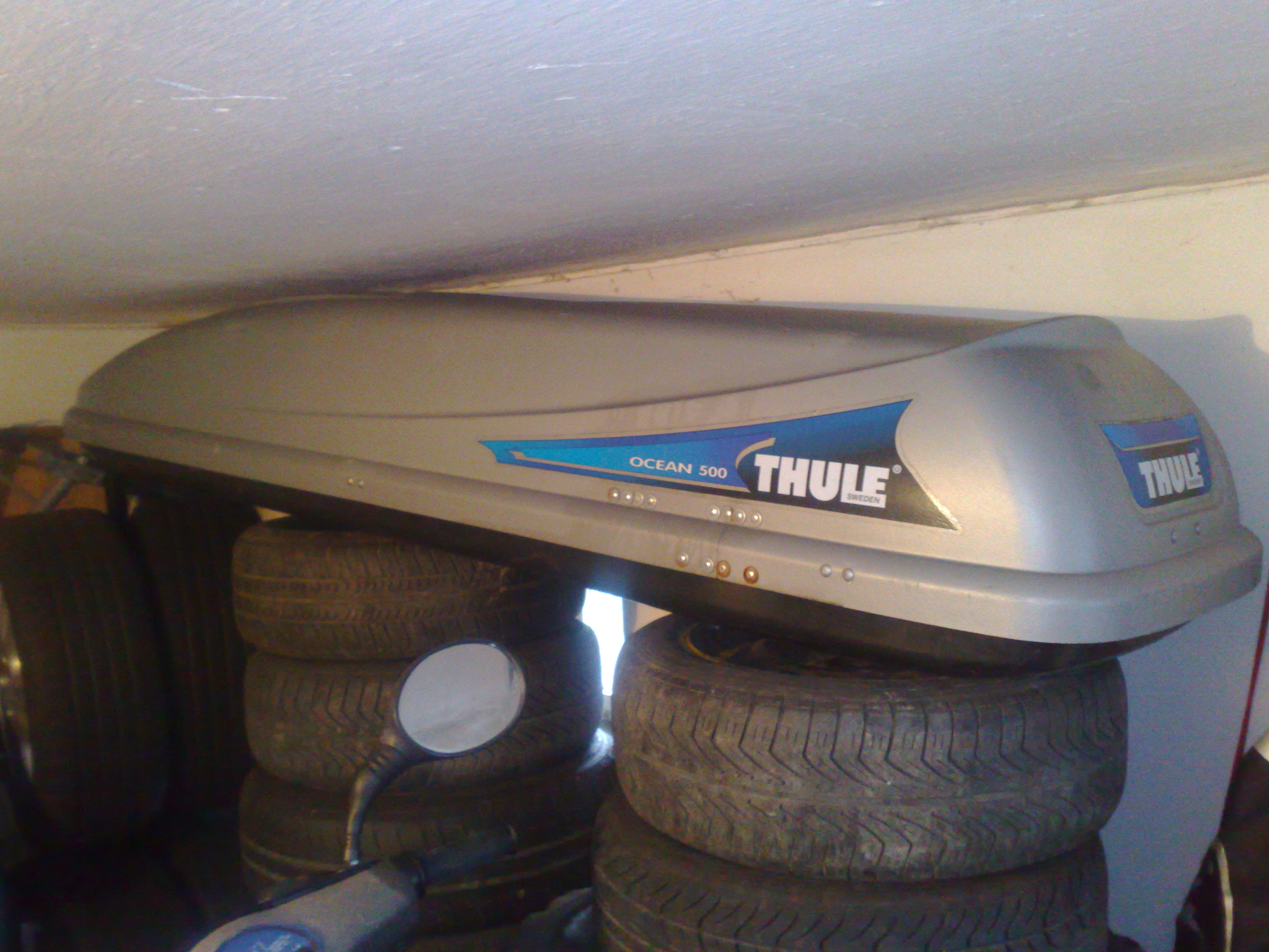 1) Znackova rakev Thule Ocean 500, centralne zamykatelna, pantove zavirani, sezonne pouzivana, objem 310 l , vyrobce udava obsaditelnost 5 pary lyzi nebo 4 snowboardy. Pred lety 1x ulitla Úsměv , takze byla svarovana plastakem a zpevnovana pro jistotu zevnitr kovovymi destickami (LZ cast, nyty jsou videt na foto), material drzi bez problemu. Tento typ se stale prodava, novy dnes cca 6.500,- Kc.