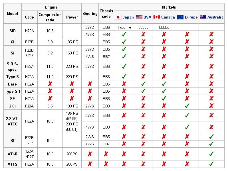 Ač tomu moc nerozumím, tak označení motoru je H22A5 ten má 136kw a H22A8 má těch 147kw. Myslím, že vyšší výkon je zvýšením kompresního poměru. Jo a ten první má černý ventildeklík, zatímco druhý ho má pěknej červenej. OK