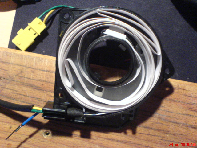 Jelikož jsem si utrhl (překroutil) cívku airbagu tak jsem se rozhodl že se pokusím ji nějak opravit Se stydím Po rozdělání cívky jsem zjistil ,že tam vlastně není nic složitého jen 6 žilný plochý kabel ,který se utrhl z konektoru. Konektor jsem zrušil a natvrdo jsem tam připájel 3 drátky které jdou vidět na fotce. 2 krajní jsou širší jsou na airbag a potom jeden na klakson ,ale může se to lišit vzávislosti o jaký typ auta jde. Tohle je třeba anglán 1,4 66kW r.v.00. Je to jen takový pokus jestli to bude fungovat. Jinak samozřejmě sháním novou cívku