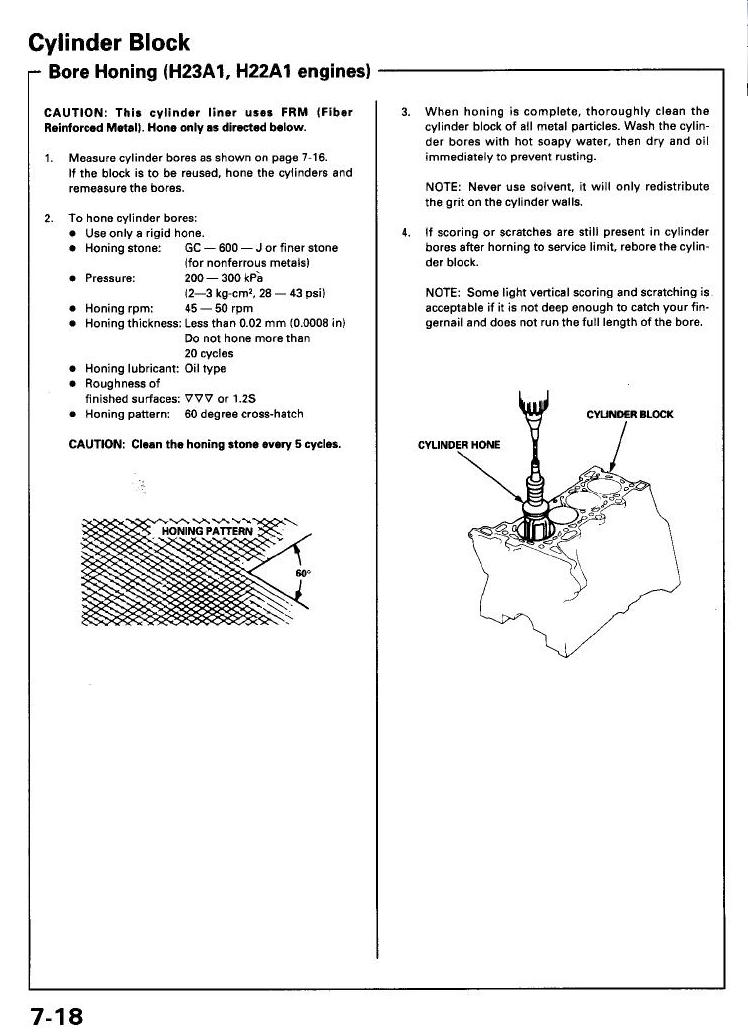 Celohlinikove bloky rady H nemaji na sobe zadny nikasil, ale vlozky valcu jsou vyrobene technologii FRM (Fiber Reinforced Metal) a samozrejme se daji honovat (viz stranka z manualu co sem dal mot). Daji se dokonce i prevrtat o 0.25mm a normalne se na to daji i sehnat pisty + pistni krouzky at uz od Hondy nebo aftermarket. Pokud nastane situace ze nepomuze ani prevrtani, da se blok prevlozkovat nalisovanim nebo vsazenim litinove vlozky (treba Darton apod.)
