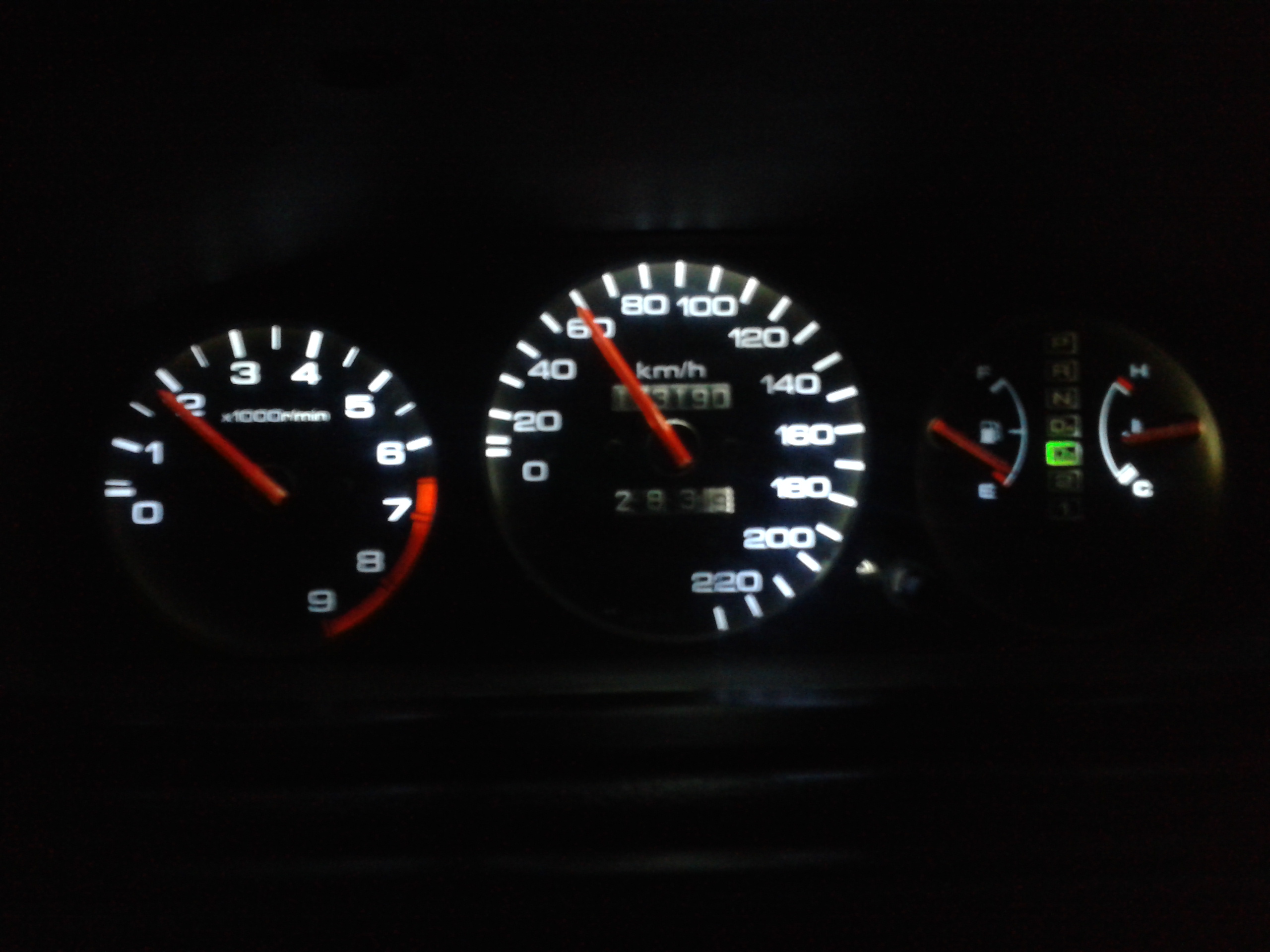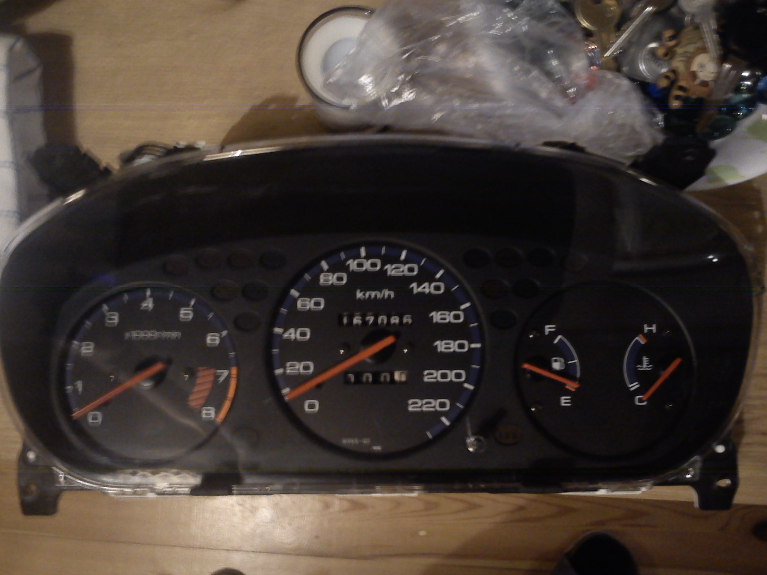 červená fluoresceční barva z modelářských potřeb, natřeny dvě vrstvy po cca 3 hodinách schnutí. Pak nechat schnout přes noc doma, nečím zabránit tomu aby se ti to nepřilepily ručičky k dorazu na 0 . např. novinovým papírem a občas to lehce odlepit. Bacha při demontáži i montáži jednotlivých budíků , jak to přeženeš s utahováním , tak hlavně palivoměr a teploměr snadno strhneš a bude to ukazovat blbě nebo vůbec. Je to jen velmi lehce utažený. Nebo prostě sundat to přední plexi nad budíkama a nevyndavat je. Já budíky vyndaval protože jsem dělal i podsvícení led páskama. Fotky jsou v noci, jedna s bleskem, jedna bez... možná to chce ještě jeden nátěr ale vidět to je dobře.