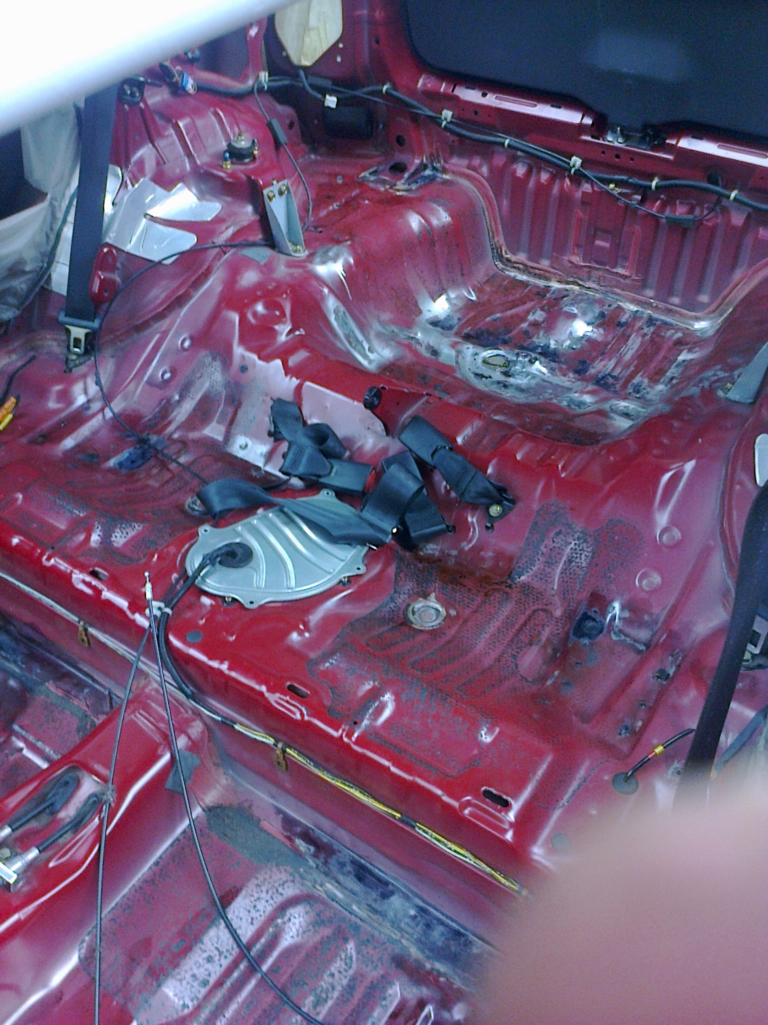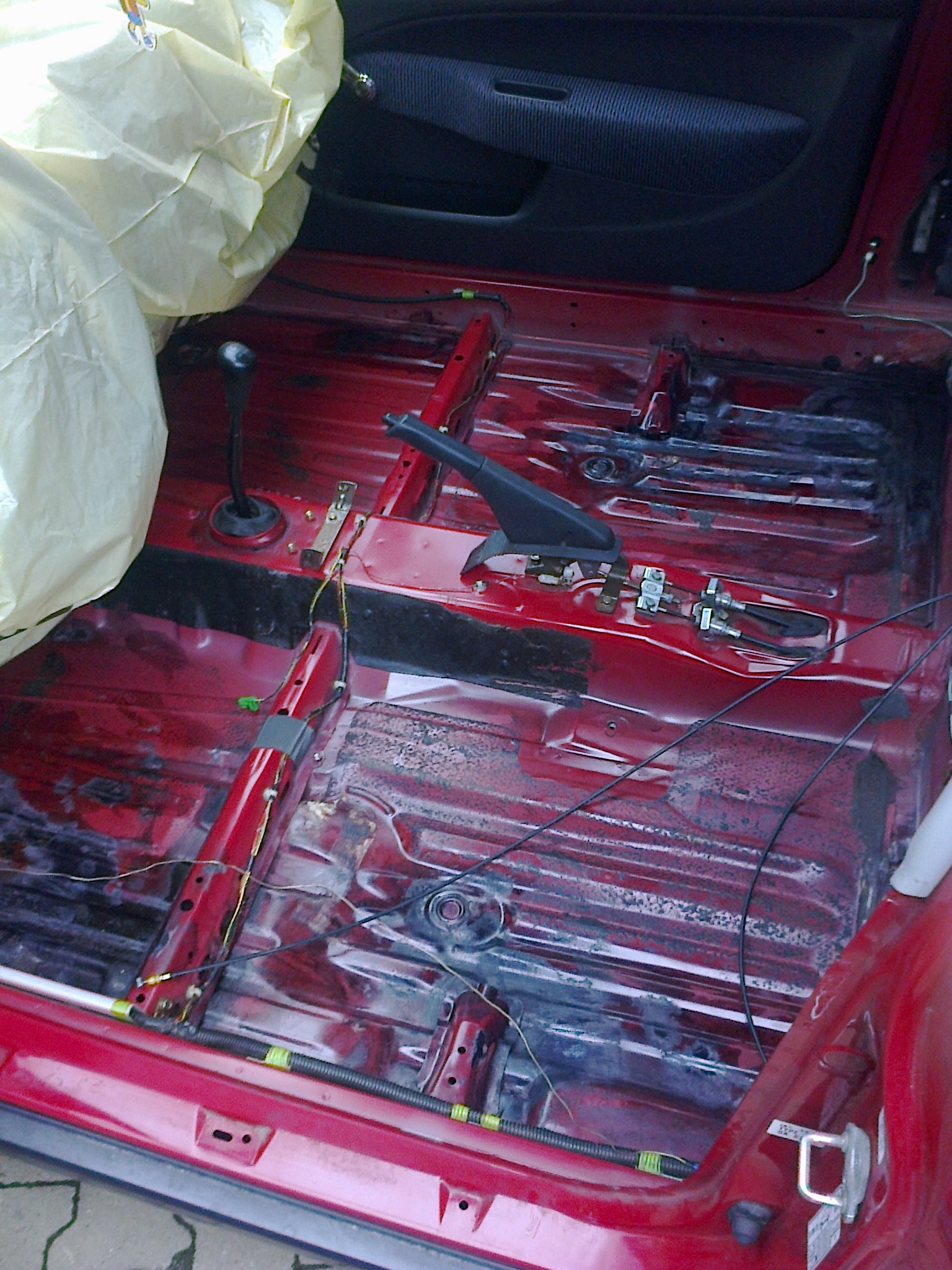 Dnešním dne jsem započal kompletní renovaci karoserie u mého Civica. Poté co jsem rozebral interiér, tak jsem z hrůzou zjistil, že podlaha na dosti místech rezatá, naštěstí se jedná o povrchovou rez a tak jsem jí komplet obrousil až na čistý plech a na postižená místa jsem nanesl odrezovač na bázi kyseliny fosforečné.