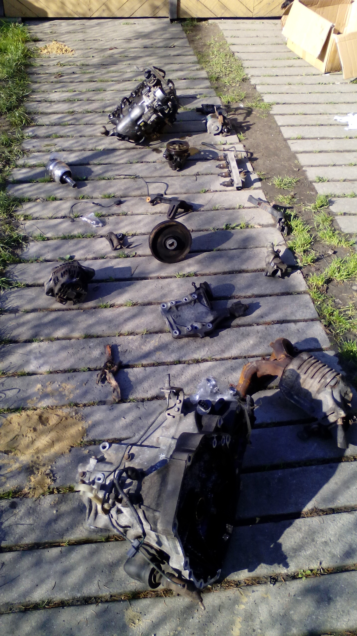 Hondě zdar Honda mam tady díly z hondy civic 1.5 EKO V-TEC. D15Z6 .. Starter , v-tec ventil , rozdělovač , svody s katalyzatorem , sání , vstřiky , řemenici , napínáky , sondu lambdu (jednožilova) , převodovku , řídící jednotku, budíky a další drobnosti... nemám karosarske díly jen to co je tady vypsano a popřípadě na obrazcích..[b] Je to tam.