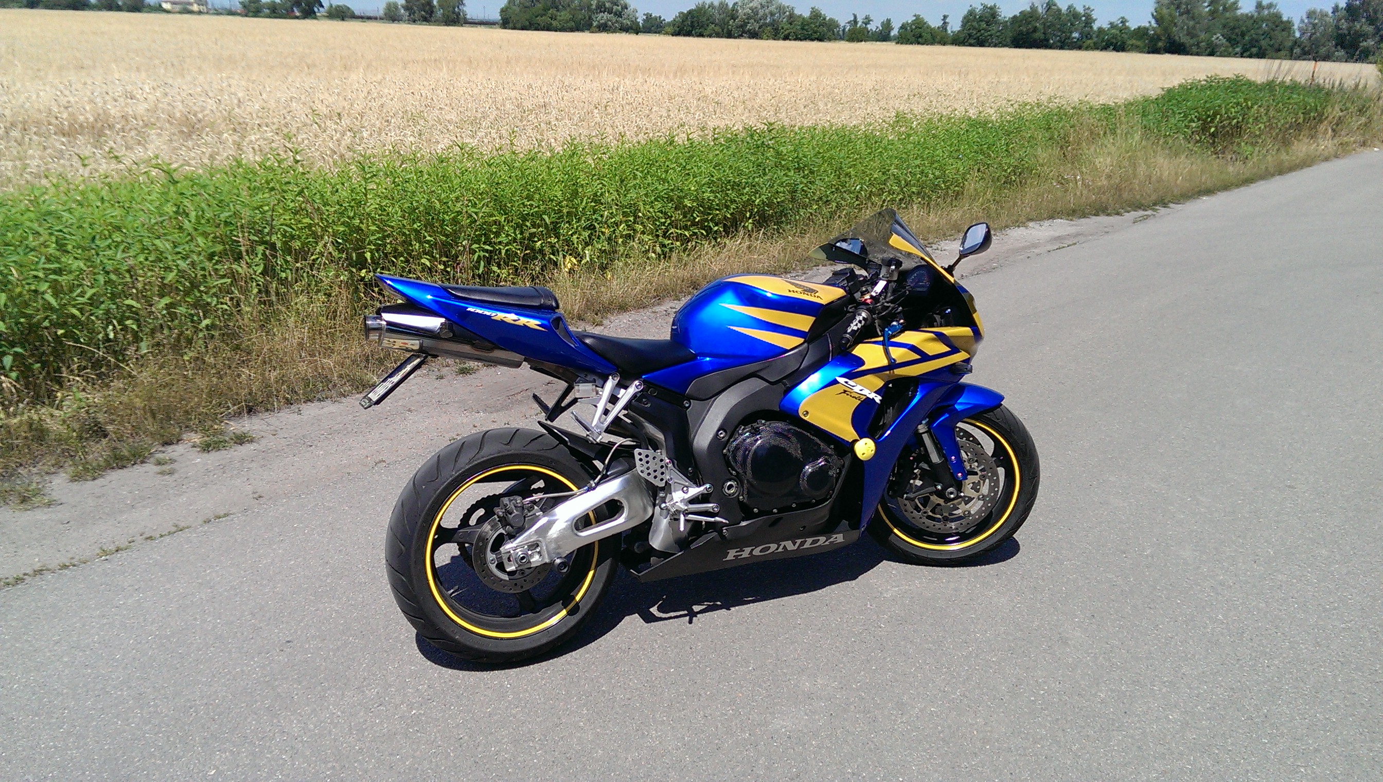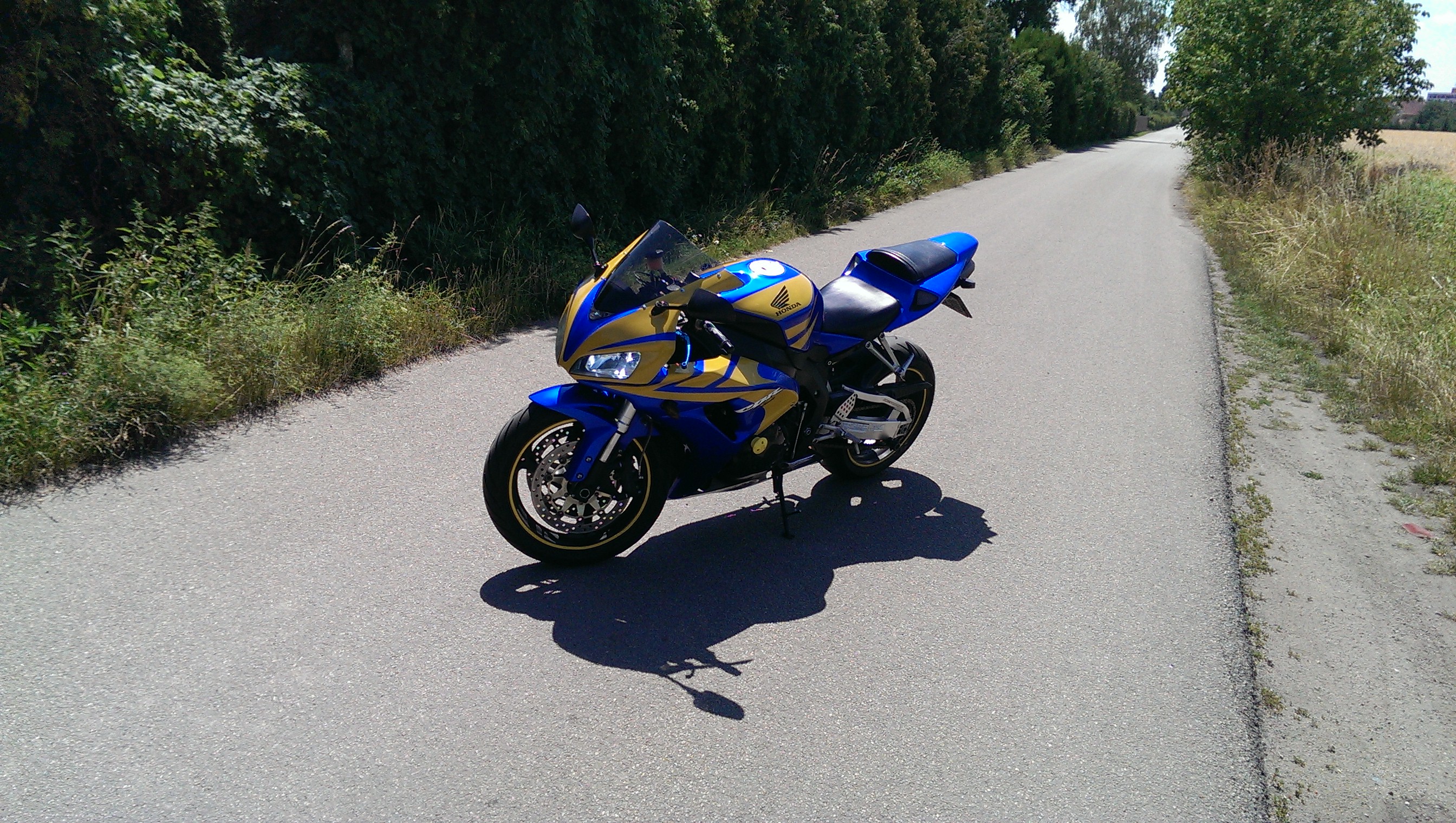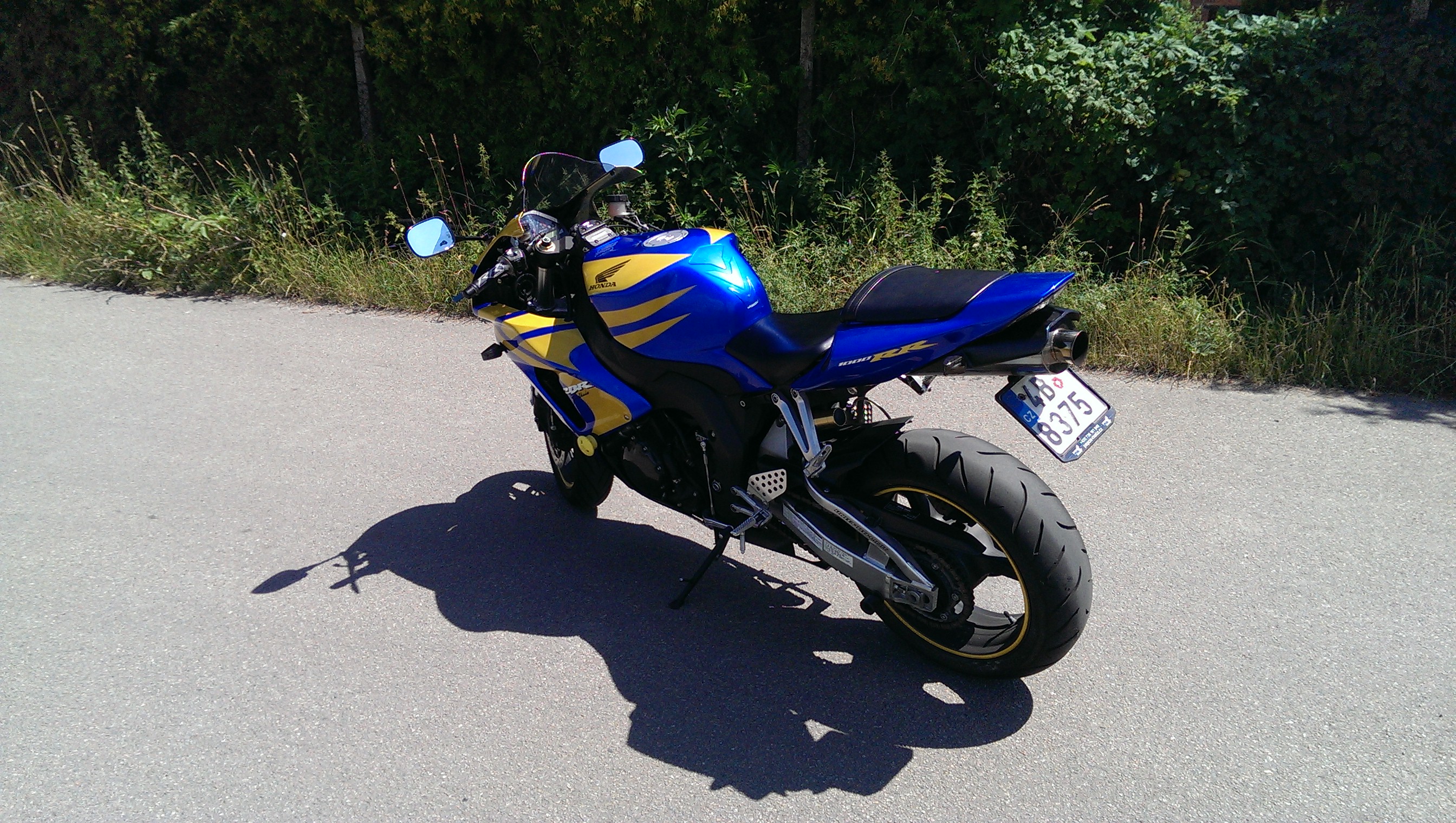 Protože se na ni byli podívat jistí vykukové tak radši připíšu že je to osm let starý stroj, dovezený z USA má najeto originálních 21500km a byl položen asi na pravou stranu, podle šktrnuté zadní stupačky, tudíž je lakovaný, a nemá originální plasty, na kterých by bylo vytisknuté logo HONDY, ale nejsou to lamina, je to normální plast, nikde nepřesahuje, není dolámaný, ani nepraská a všude sedí, je to motorka, která je naprosto vpořádku, zatím jsem nepotkal stejnou barevnou kombinaci, motor jede bez jakýchkoliv pazvuků a měla perfektní péči, po zadním nelétám a na okruhu jsem ji taky netrápil, není to vylétaná herka...