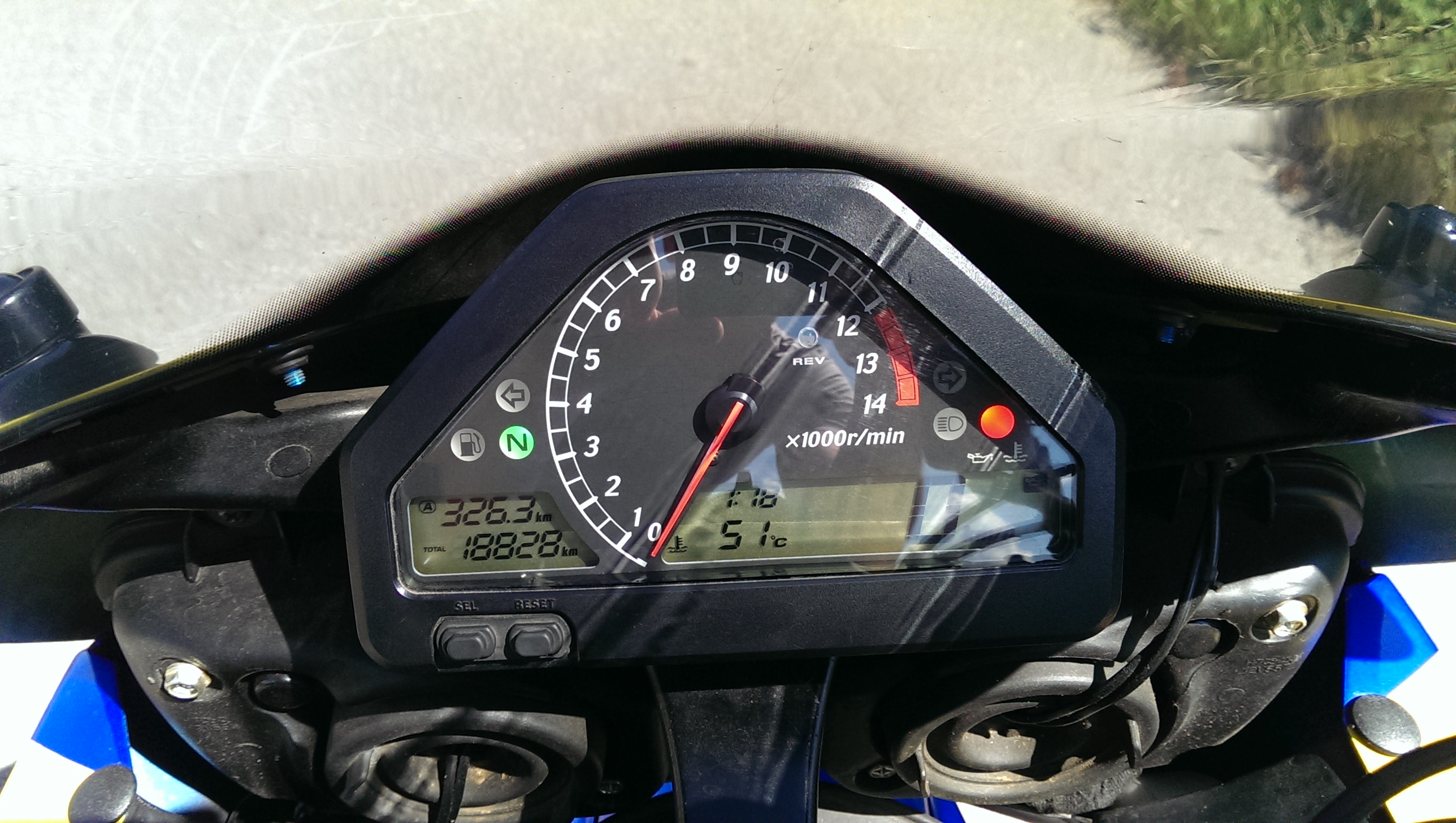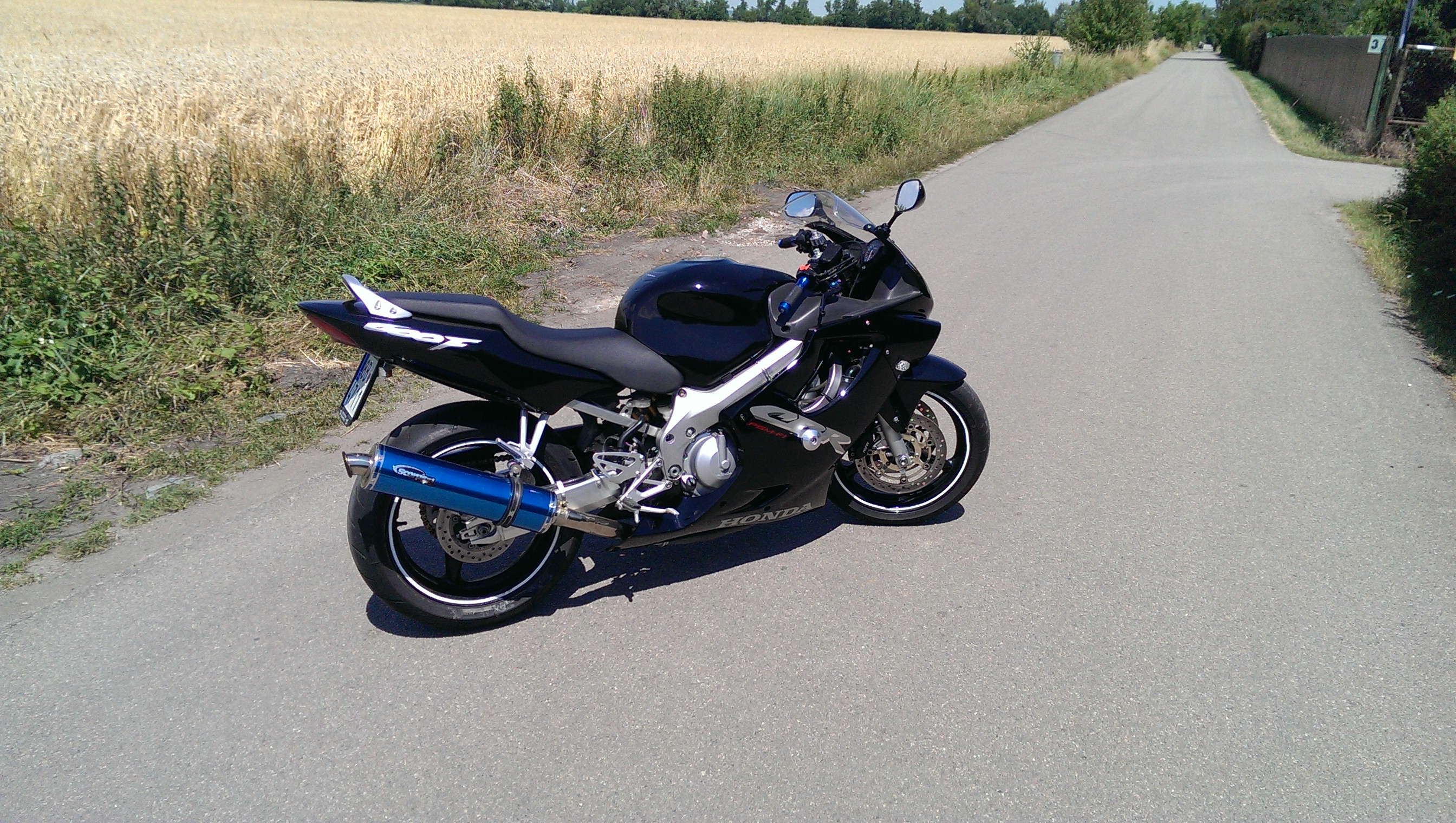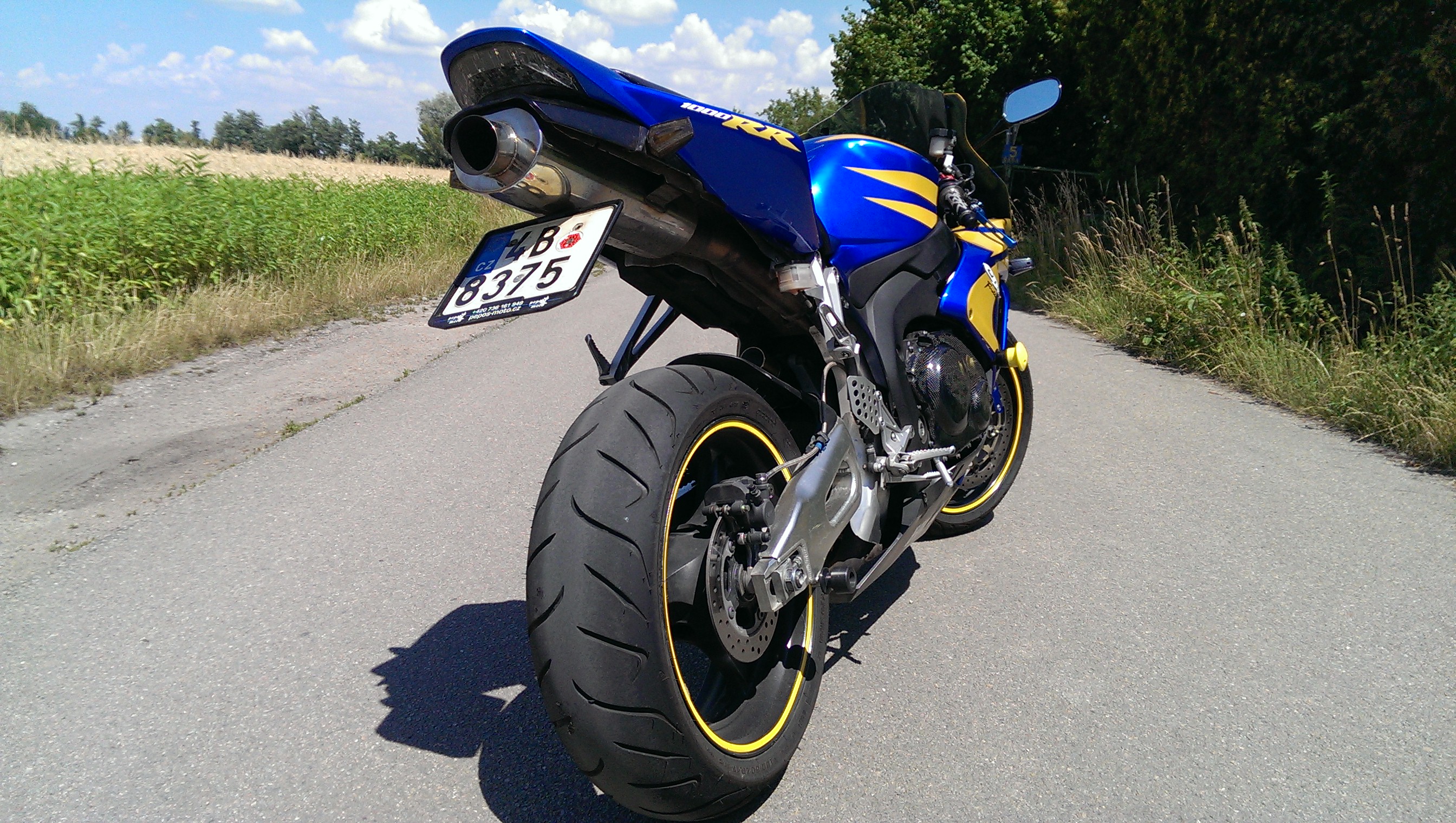 Protože se na ni byli podívat jistí vykukové tak radši připíšu že je to osm let starý stroj, dovezený z USA má najeto originálních 21500km a byl položen asi na pravou stranu, podle šktrnuté zadní stupačky, tudíž je lakovaný, a nemá originální plasty, na kterých by bylo vytisknuté logo HONDY, ale nejsou to lamina, je to normální plast, nikde nepřesahuje, není dolámaný, ani nepraská a všude sedí, je to motorka, která je naprosto vpořádku, zatím jsem nepotkal stejnou barevnou kombinaci, motor jede bez jakýchkoliv pazvuků a měla perfektní péči, po zadním nelétám a na okruhu jsem ji taky netrápil, není to vylétaná herka...