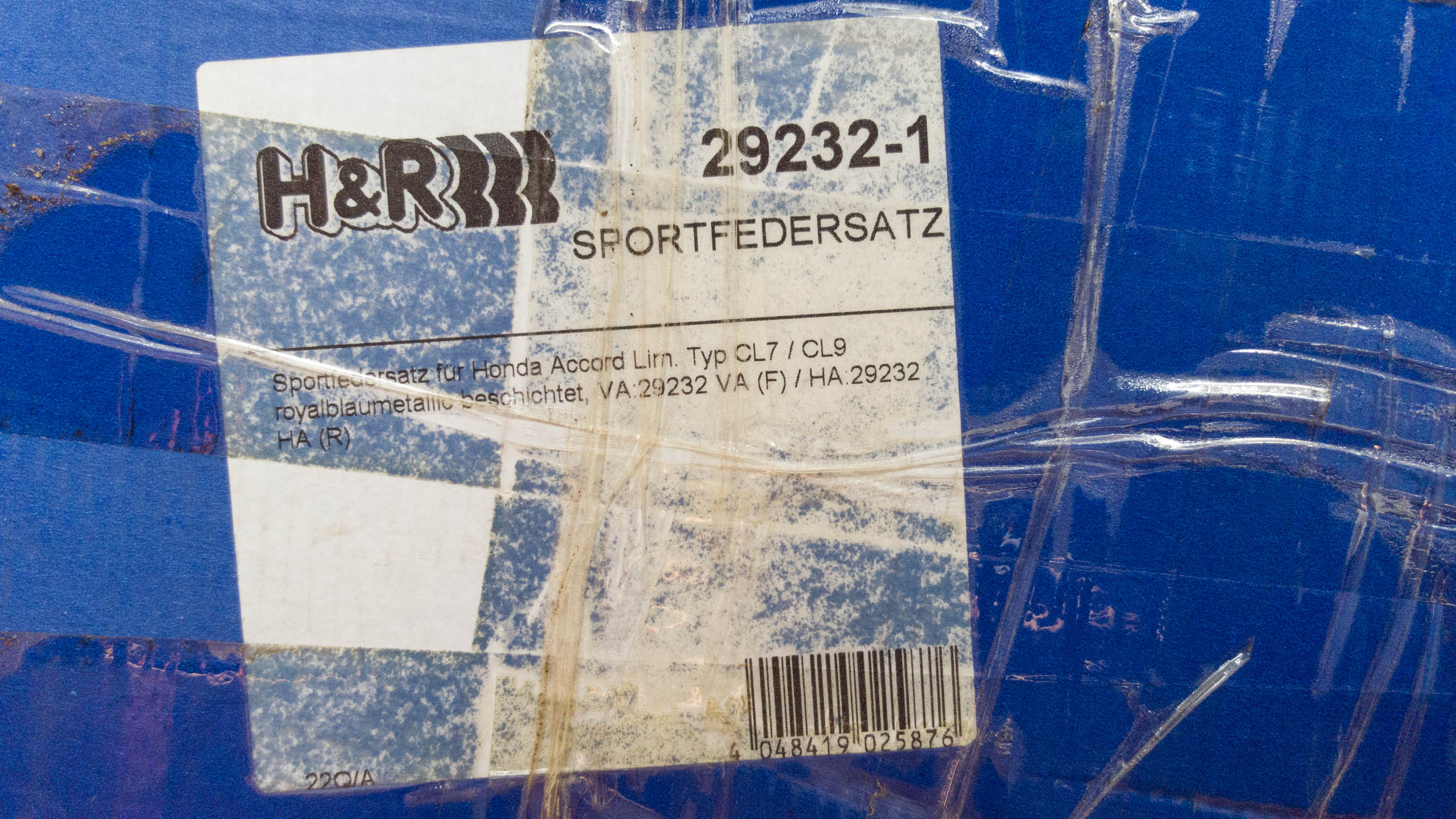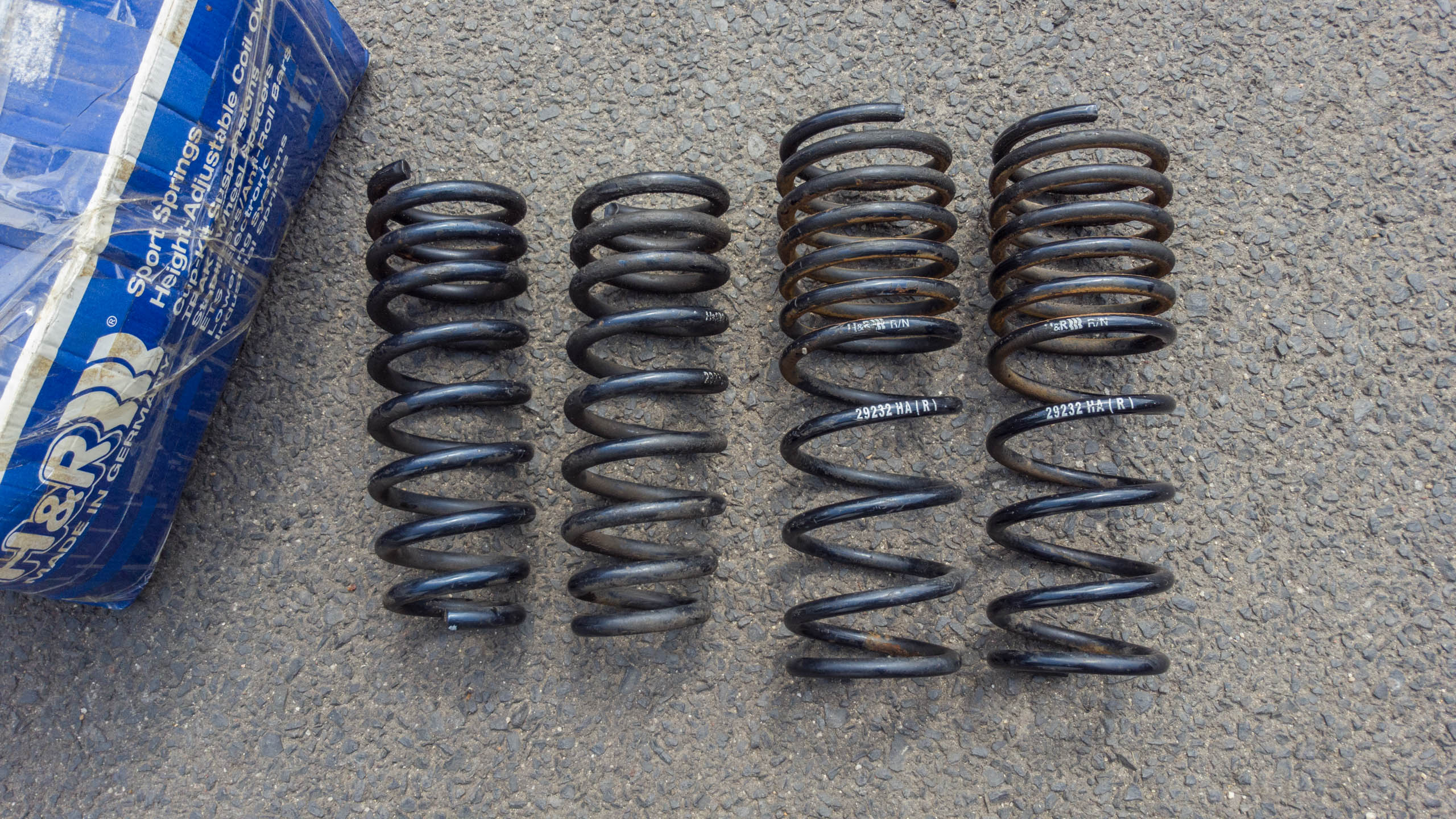 Prodám použité H&R sportovní pružiny 29232-1 na Hondu Accord CL7 sedan. Snížení o 50 mm vpředu i vzadu. Byly namontovány na autě co jsem koupil, ale preferuji základní výšku vozu. Nános špíny a rzy je jen povrchový, neměl jsem čas a chuť to čistit kvůli focení. Na funkci to nemá vliv. Na fotce je vidět výška vozu ještě s namontovanými pružinami.