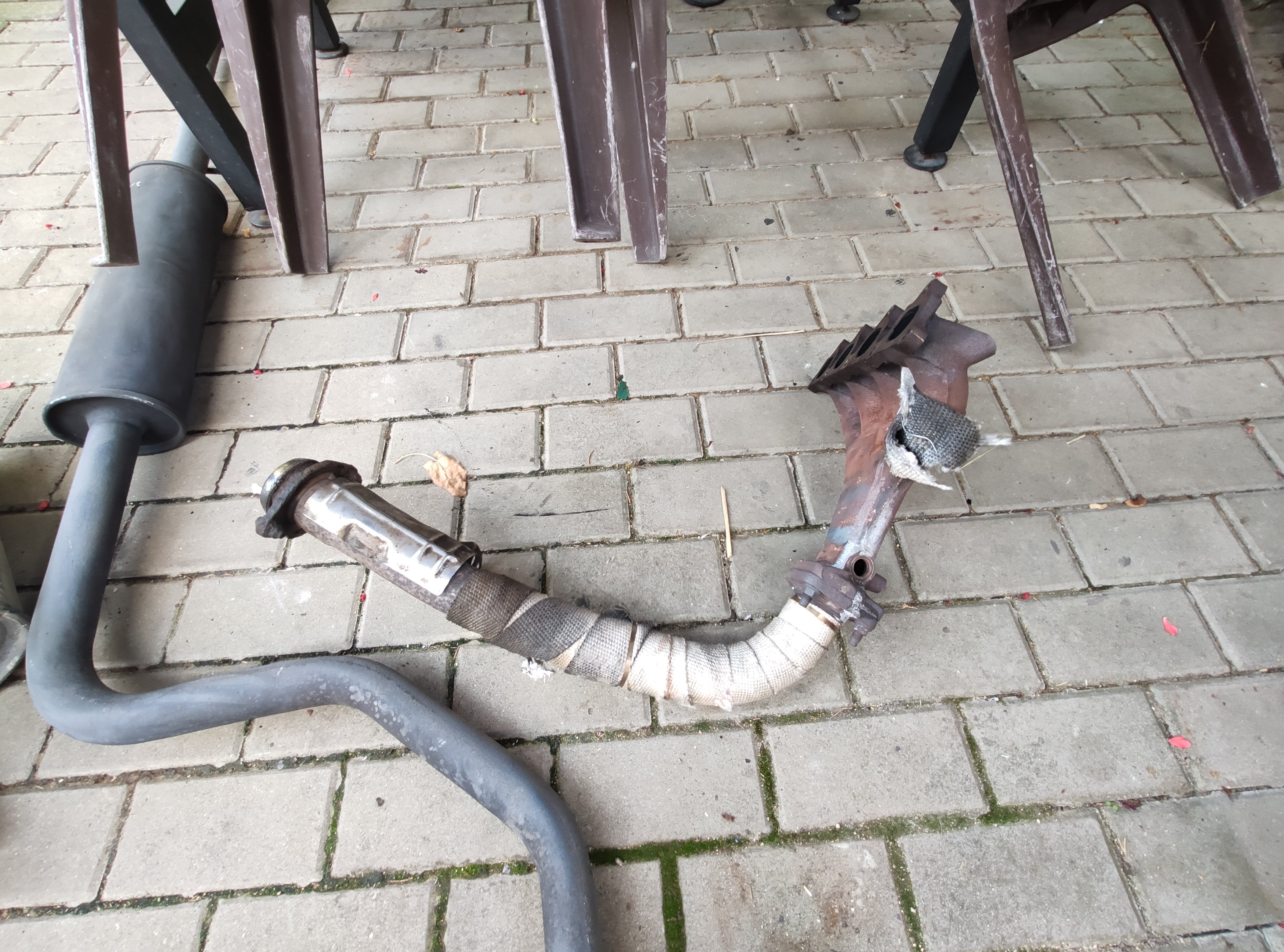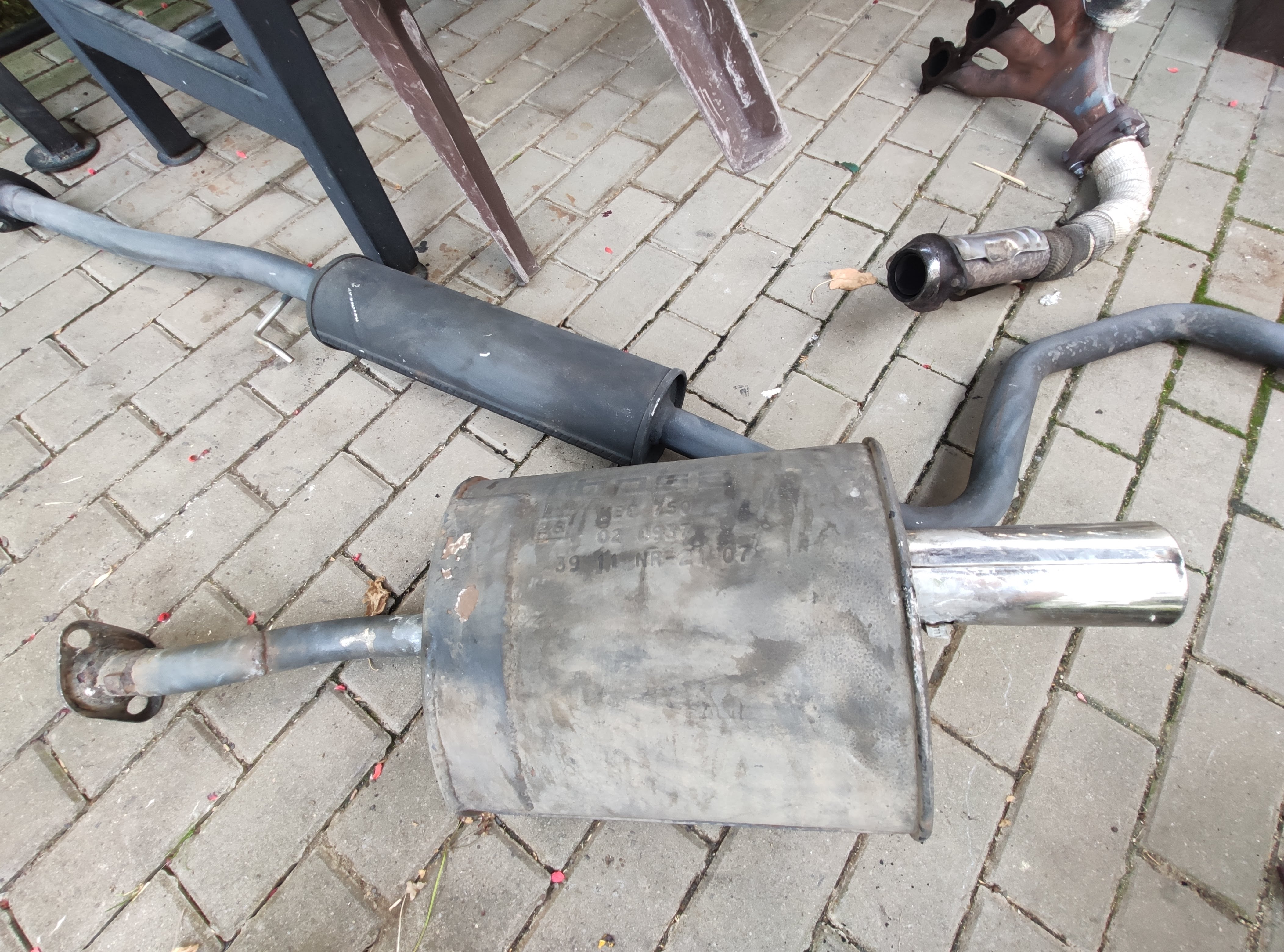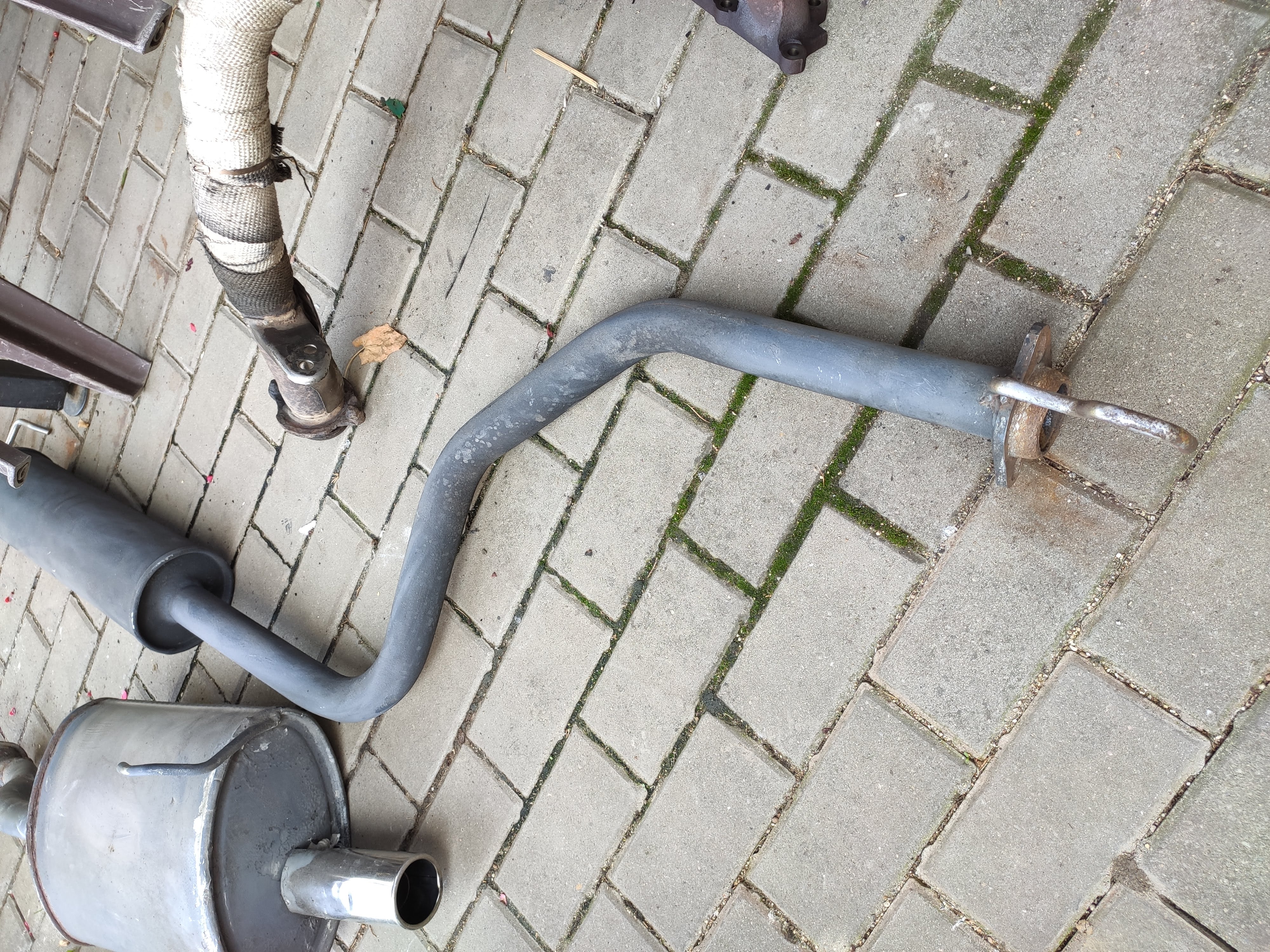 Střední díl POLMOSTROW PLM 09.57 jako nový (najeto asi 1000 km) ošetřený černou thermo barvou, zadní díl BOSAL s nerez sportovní koncovkou (opravovaný nerez plechem na obalu + přední a zadní trubka s nerezu, obal utěsněný thermo tmelem + celý díl natřen černou thermo barvou). Svody jsou originální litinové omotané páskou. Jsou však prasklé, je nutno vyvařit.