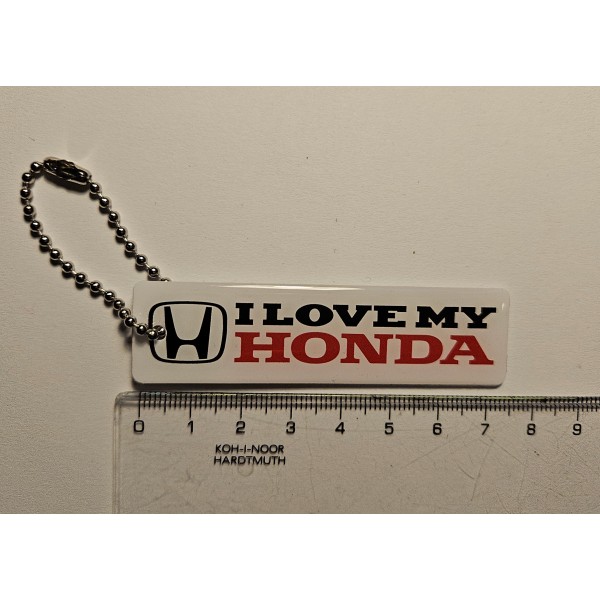 Silikonový přívěšek s logem Honda a nápisem I love my Honda. Bílé pozadí s černým a červeným nápisem.